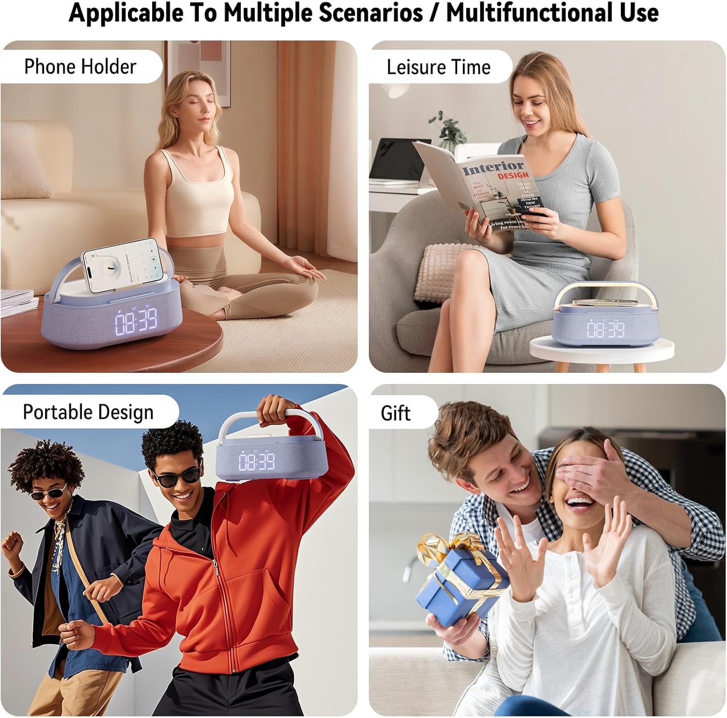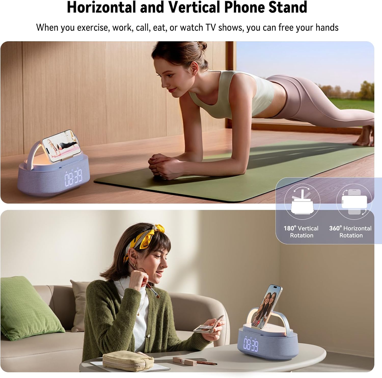 - đă 6-in-1-Multifunktions-RadioweckerăSie erhalten einen Bluetooth-Lautsprecher + digitalen Wecker + kabelloses 15-W-LadegerĂ€t + UKW-Radio + 4-stufig einstellbares Nachtlicht + Handyhalter.