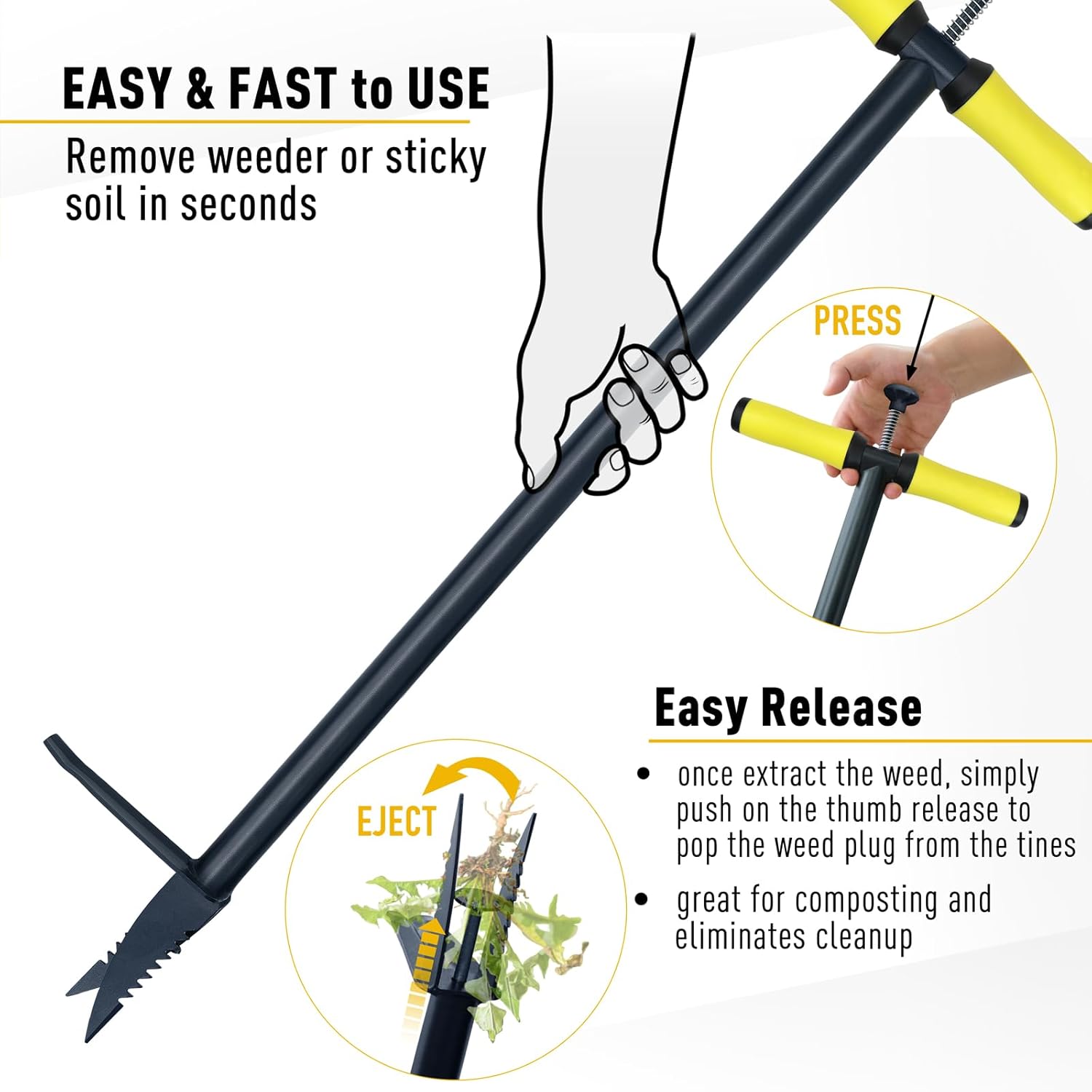 • Einfach zu bedienen: Halten Sie einfach aufrecht, zentrieren Sie über das Unkraut, drücken Sie einfach die Zacken mit Ihrem Fuss in das Wurzelsystem eines Unkrauts, drehen Sie den Griff um 180 Grad und entfernen Sie das Unkraut, die Wurzeln und alle!