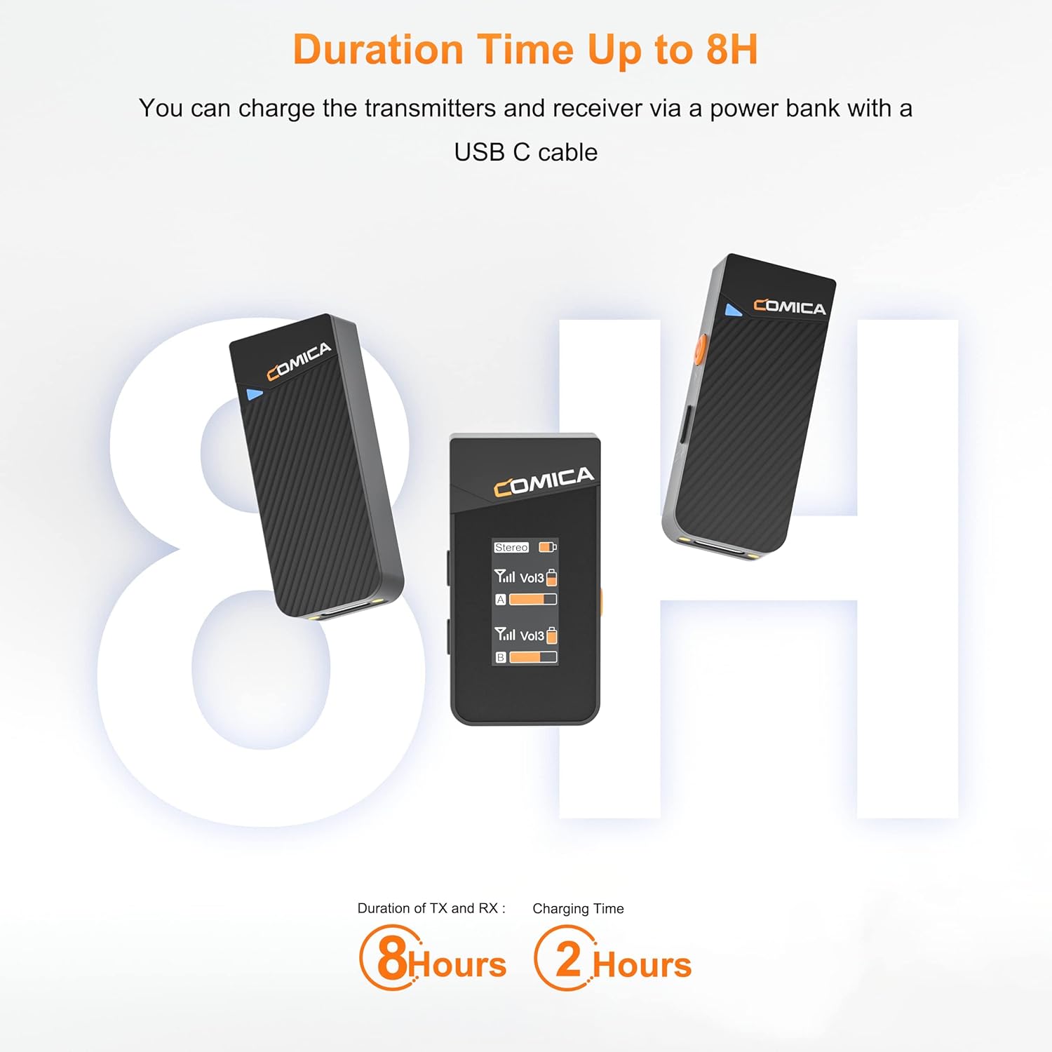 • 【8 Stunden Akkulaufzeit】 Das Vimo C2 Wireless Mini-Mikrofon wird mit einem 3-in-1-Ladekabel geliefert, Sie können 3 Mikrofone gleichzeitig aufladen. Bei voller Aufladung können Sender und Empfänger bis zu 8 Stunden ununterbrochen arbeiten.