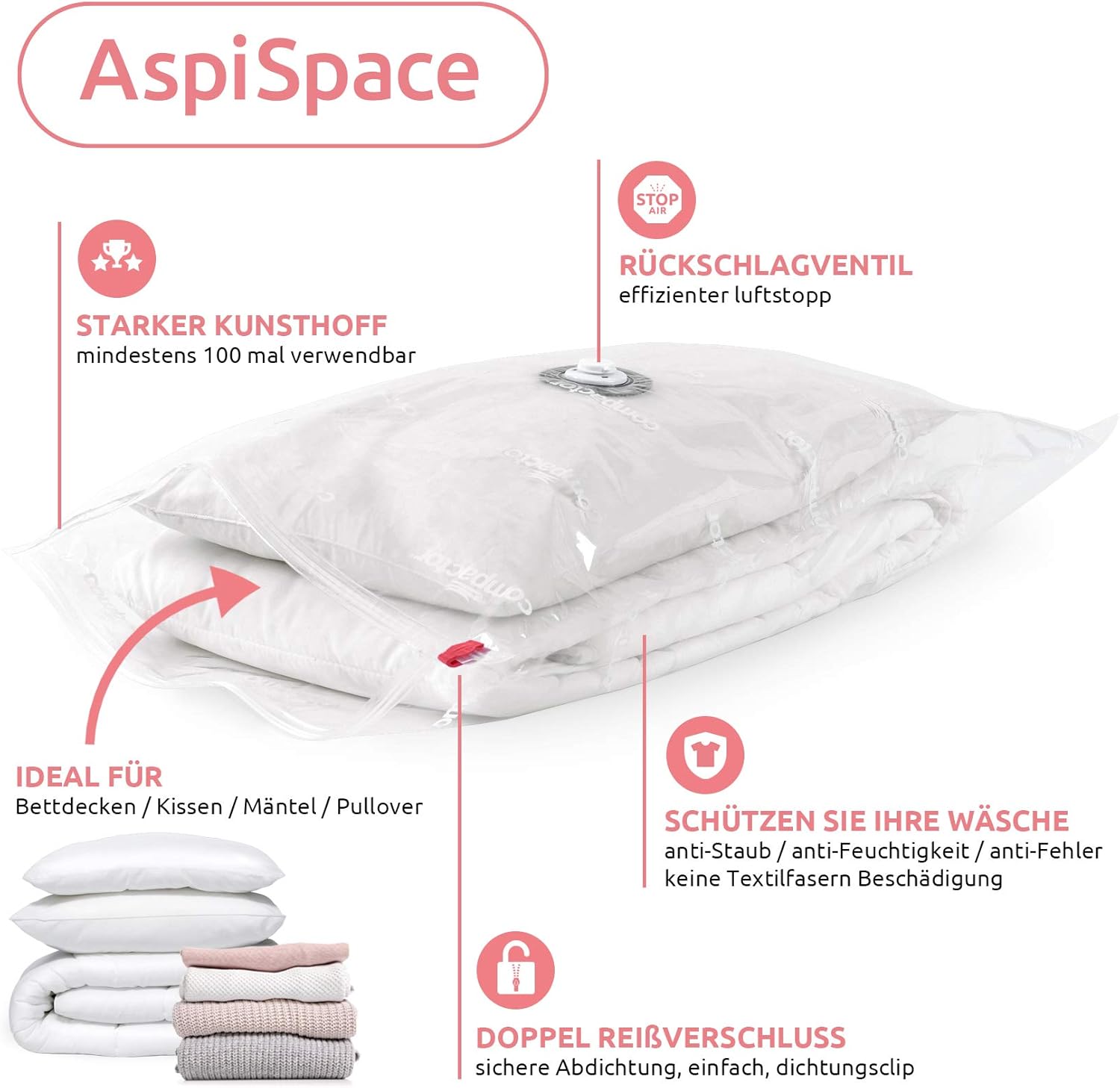 - Schnell und einfach zu benutzen: Füllen Sie den Beutel und entfernen Sie die Luft mit einem Staubsauger Das Universalventil ist kompatibel mit allen Arten von Staubsaugern Schliessen Sie den doppelten Reissverschluss mit dem mitgelieferten Schieber
