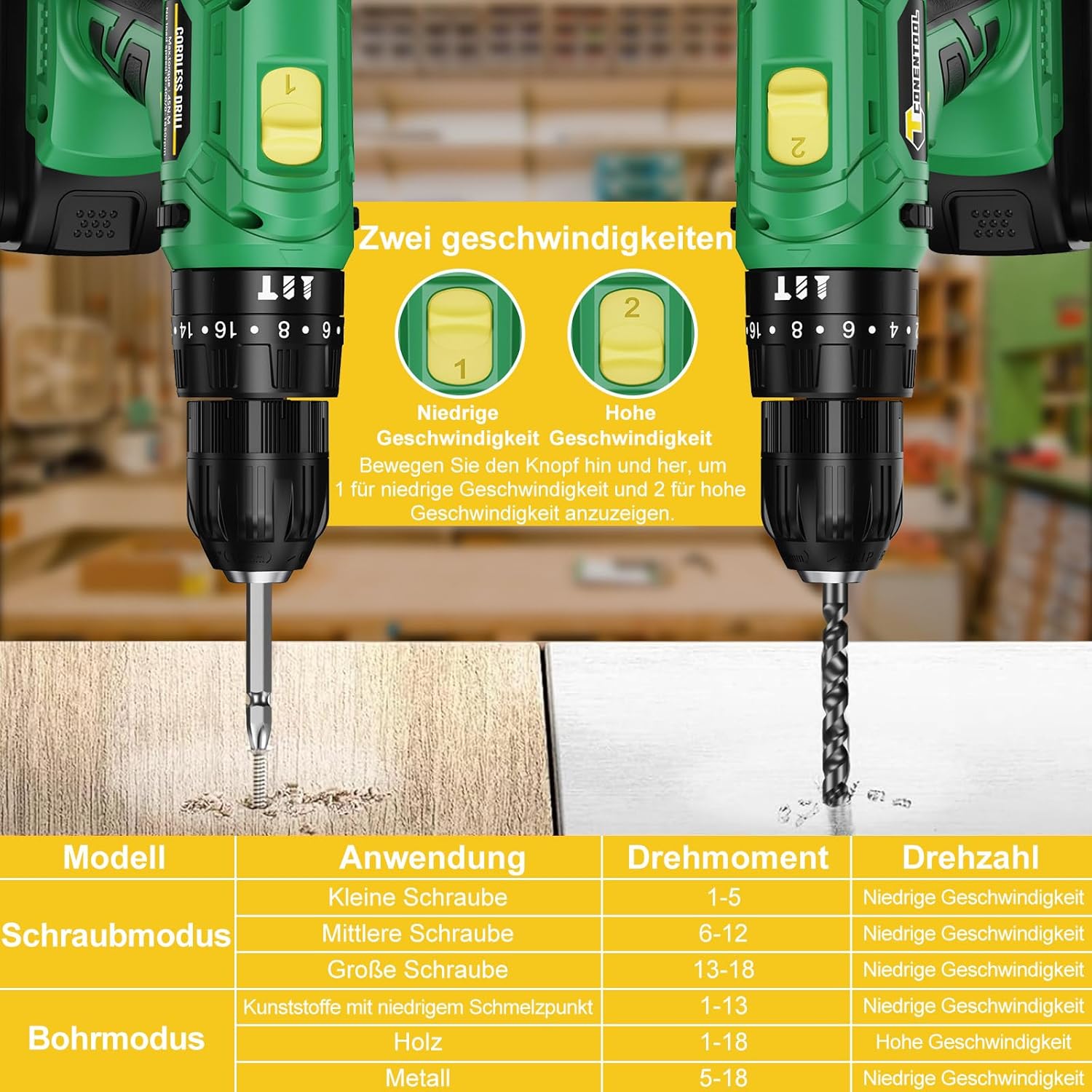 - 【2 GESCHWINDIGKEITSEINSTELLUNG】 - Die Akkuschrauber kann auf 2 verschiedene Geschwindigkeitsbereiche eingestellt werden, niedrige Geschwindigkeit (0-400rpm) ist höheres Drehmoment, geeignet zum Bohren oder Schrauben auf einigen harten Materialien.