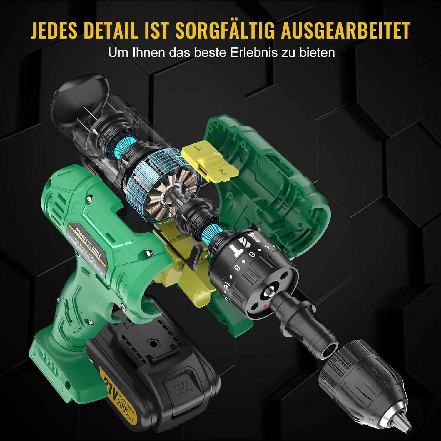 - 【MEHRFACHES ZUBEHÖR】 – Das Set enthält 1* Akku-Bohrmaschine, 1* 2000 mAh Akku, 1* Tragetasche, 6542-Spiralbohrer*4, 32-Schraubendreherbit*1, kleinen Schraubendreherbit*8, Adapter*2, Schlauch*1 und Zementbohrer *3