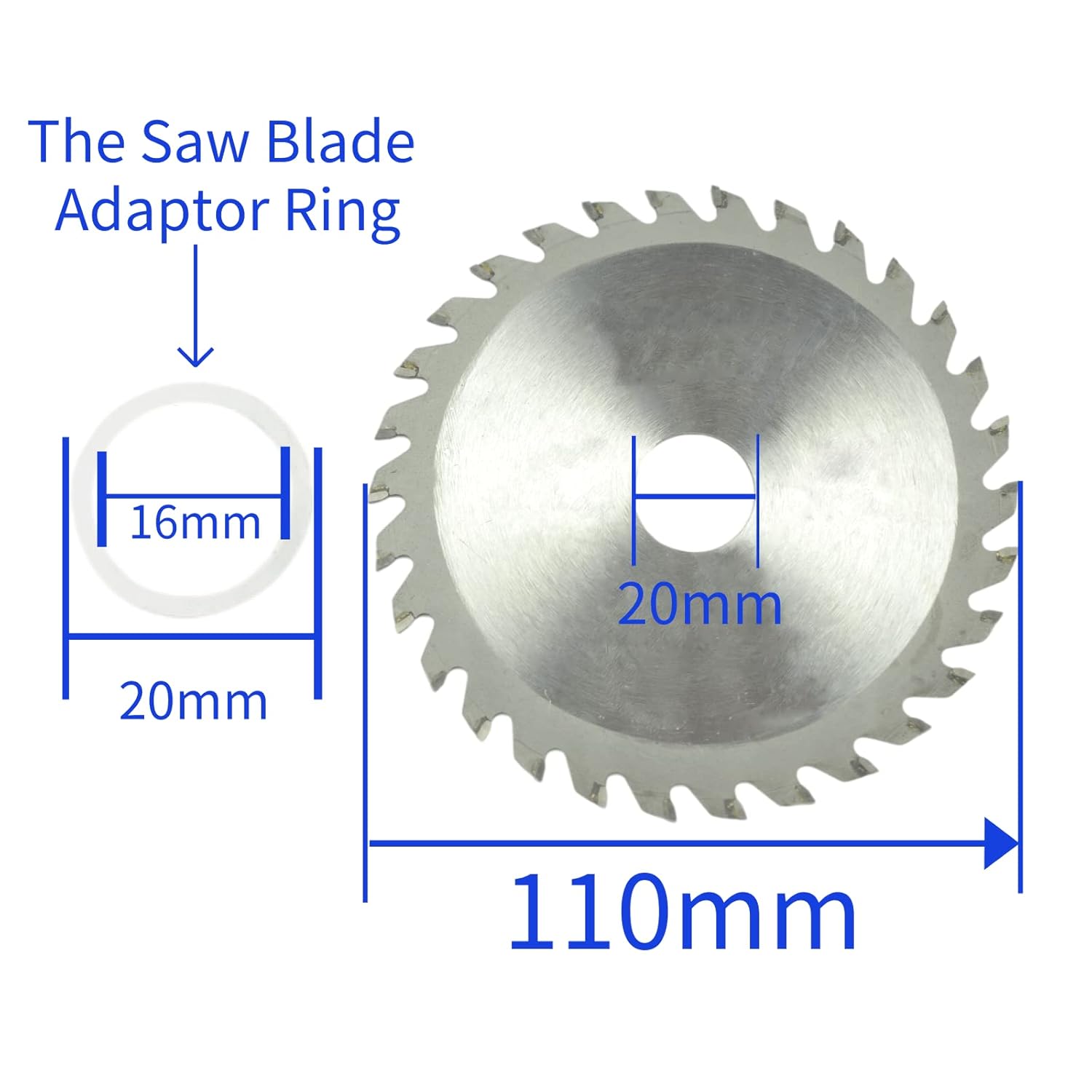 - Spezifikationen des Sägeblatts: Aussendurchmesser: 110 mm, Innendurchmesser: 20 mm, Sägeblattadapterring: Aussendurchmesser: 20 mm, Innendurchmesser: 16 mm