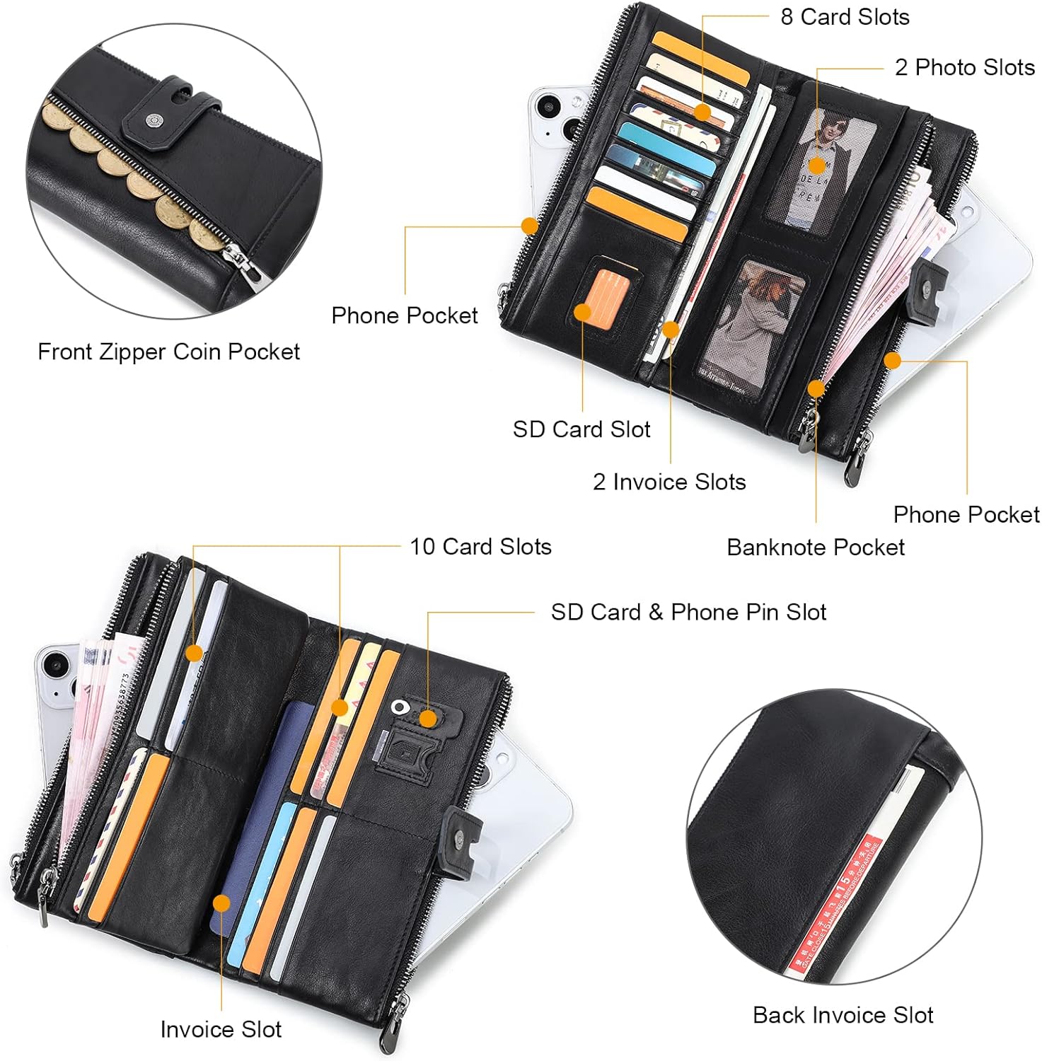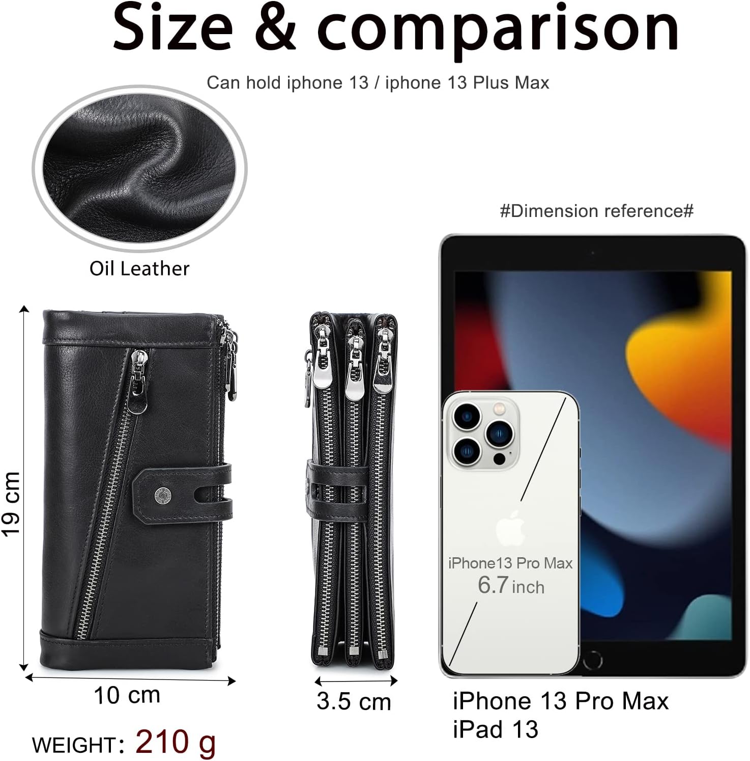 - 3 Reissverschlusstaschen bieten Platz für Banknoten, grössere Scheine, Scheckheft, Handy, iPhone 8; Rückseite hat 1 langen Steckplatz für Rechnung, Quittung;