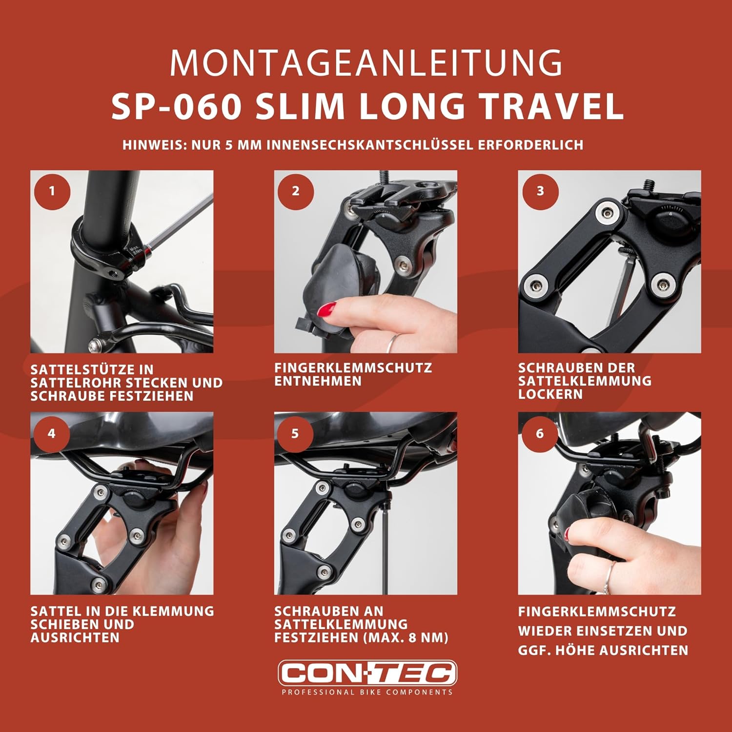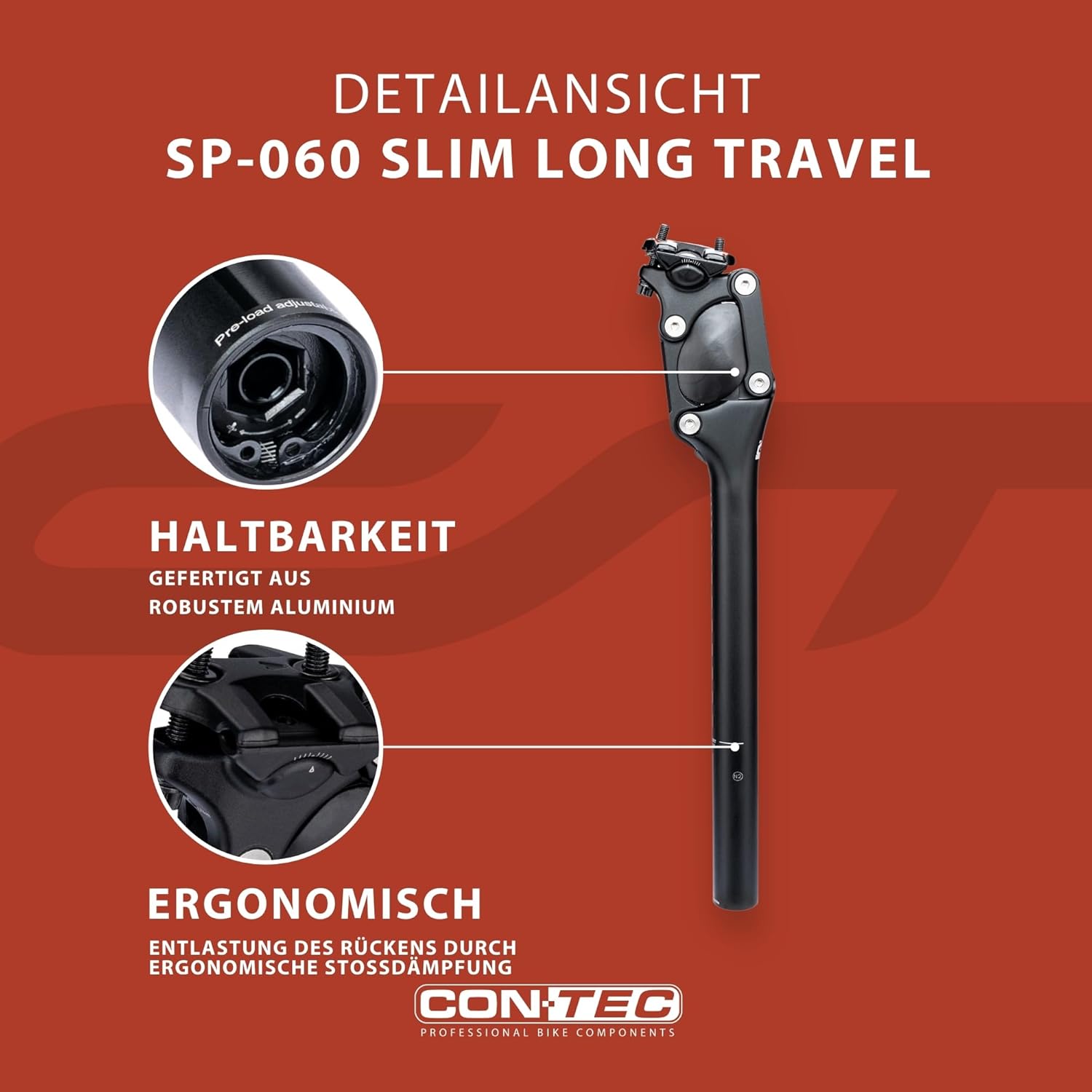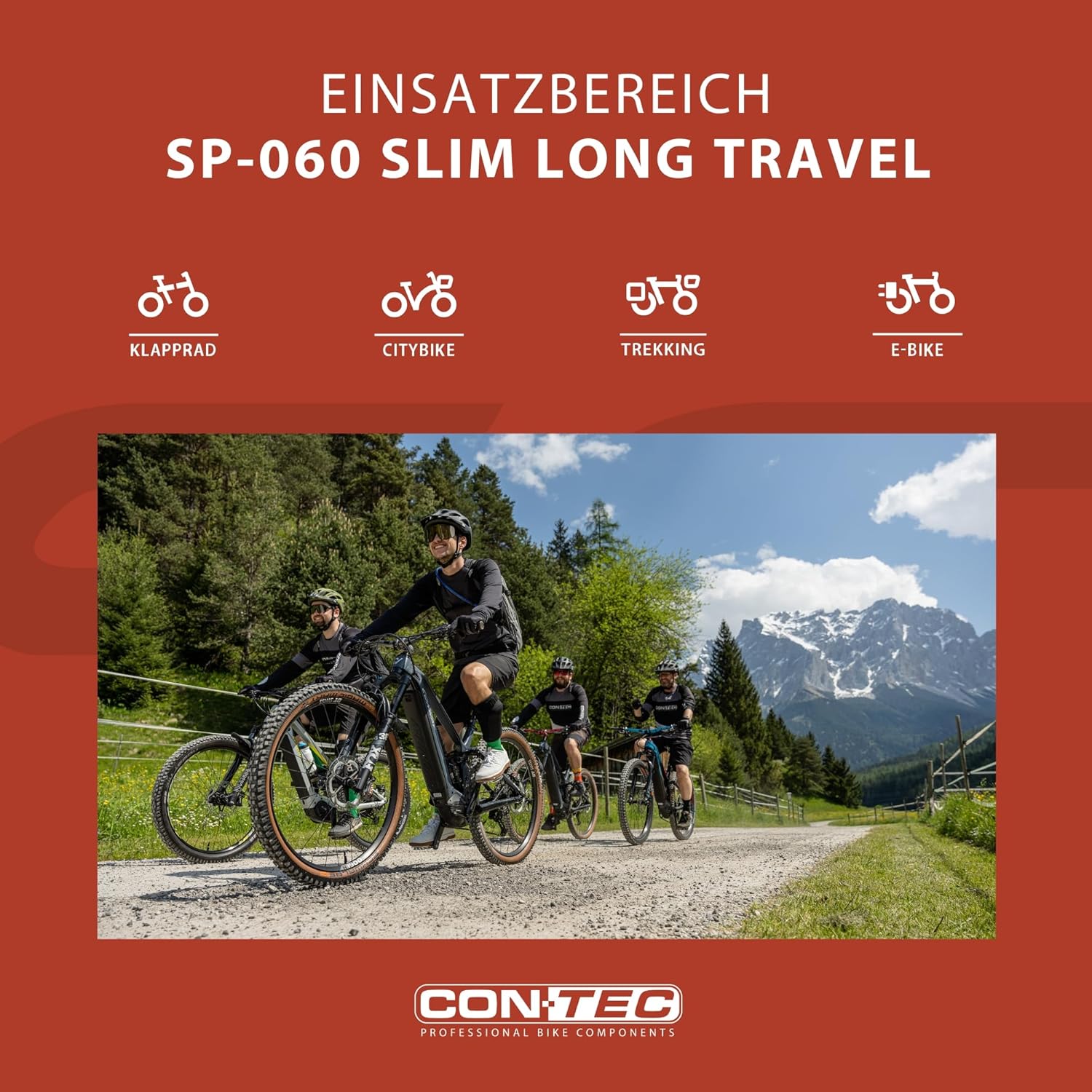 - CONTEC Parallelogramm Federsattelstütze Patent "SP-060 Slim Long Travel" 36mm Federweg (24mm horizontal / 28mm vertikal), für 70-85kg Fahrergewicht, 350mm lang, schwarz schlanker, leichter, mehr Federweg, mit einteiligem Unterrohrsortiment und