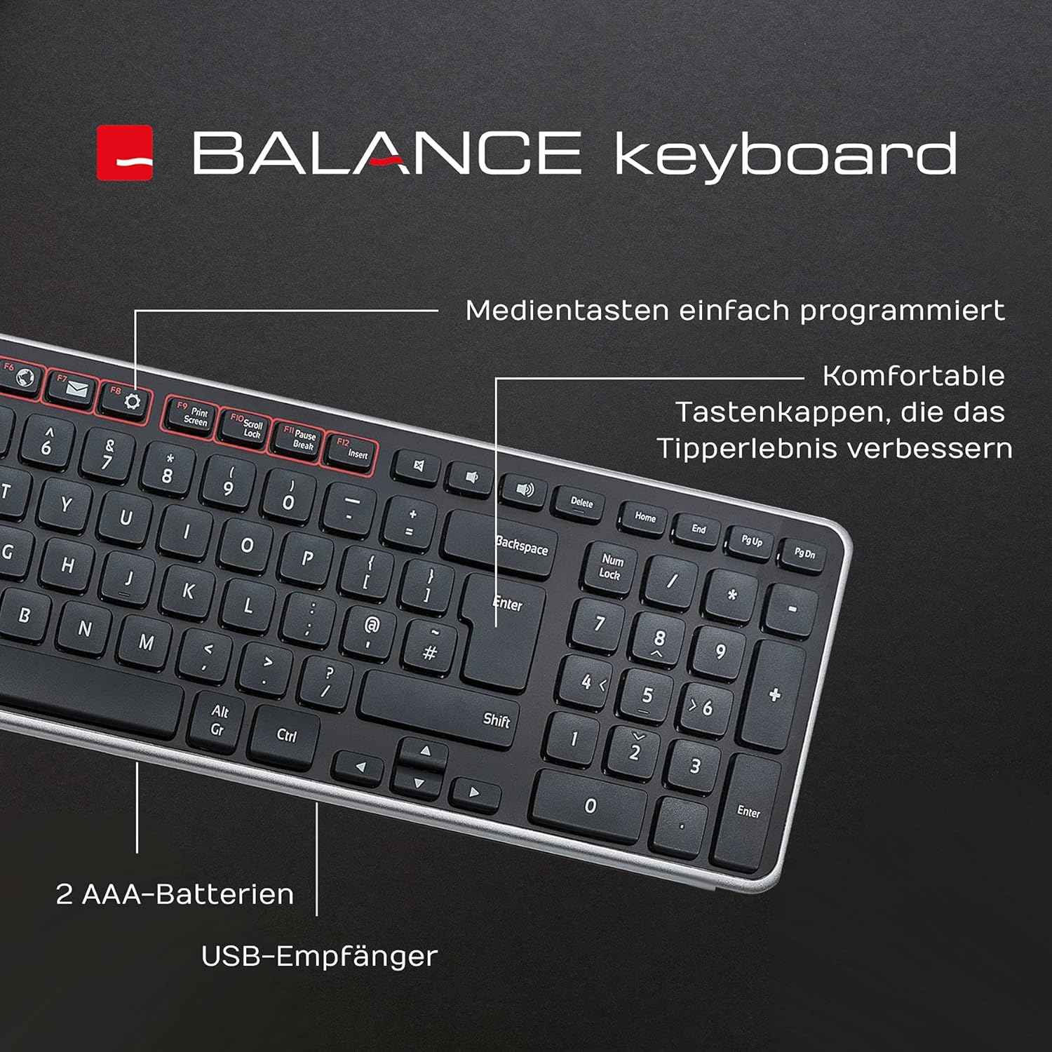 - PERSONALISIERBAR: Die Medientasten Ihres Balance Keyboards erfüllen nützliche Aufgaben und sind individuell programmierbar (nur für MAC OSX). Alle Funktionstasten (F1-F12) sind programmierbar – der direkte Zugriff erfolgt per Fn-Taste