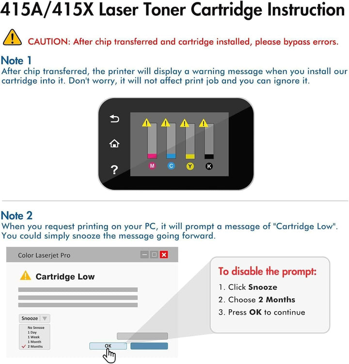 - Seitenleistung: 2,400 Seiten pro 415A W2030A (Schwarz) Tonerkartusche, 2,100 Seiten pro 415A W2031A W2032A W2033A (Gelb Cyan Magenta) Farbtonerkartusche mit 5% Deckung (Buchstabe/A4)