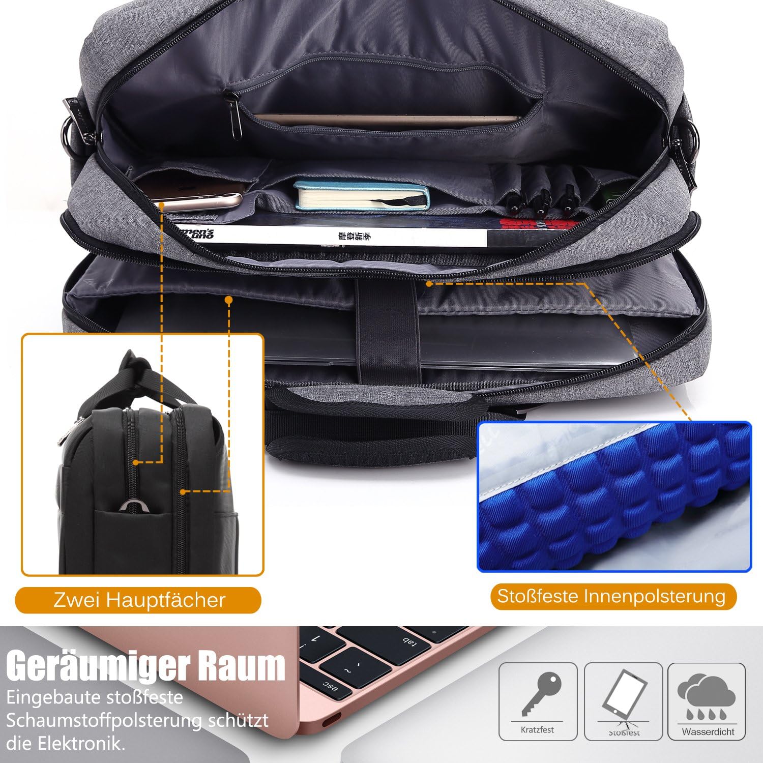 - Eingebauter schockabweisender wasserdichter Schaum kann Ihre kostbaren Artikel wie Laptop, iPad etc vor Zusammenstoss immer schützen.