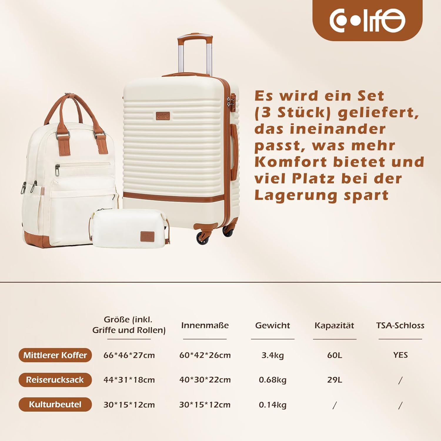 - Mittlerer Koffer-Set 3tlg:Dieses Reisekoffer Set enthält 1x Mittelgrosser Koffer(66 x 46 x 27cm), 1x Reiserucksack, 1x Kulturbeutel., von einer einmaligen Auswahl können die Bedürfnisse von Ihrer Reise erfüllen, um Ihr Leben einfacher und