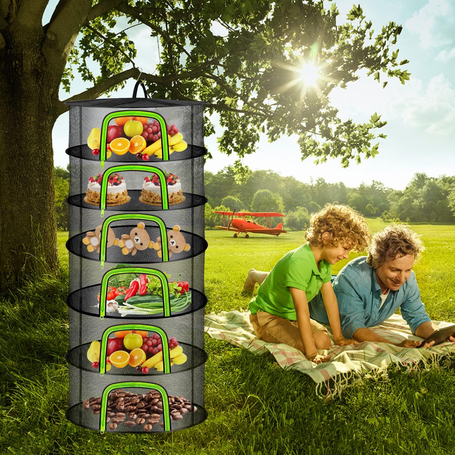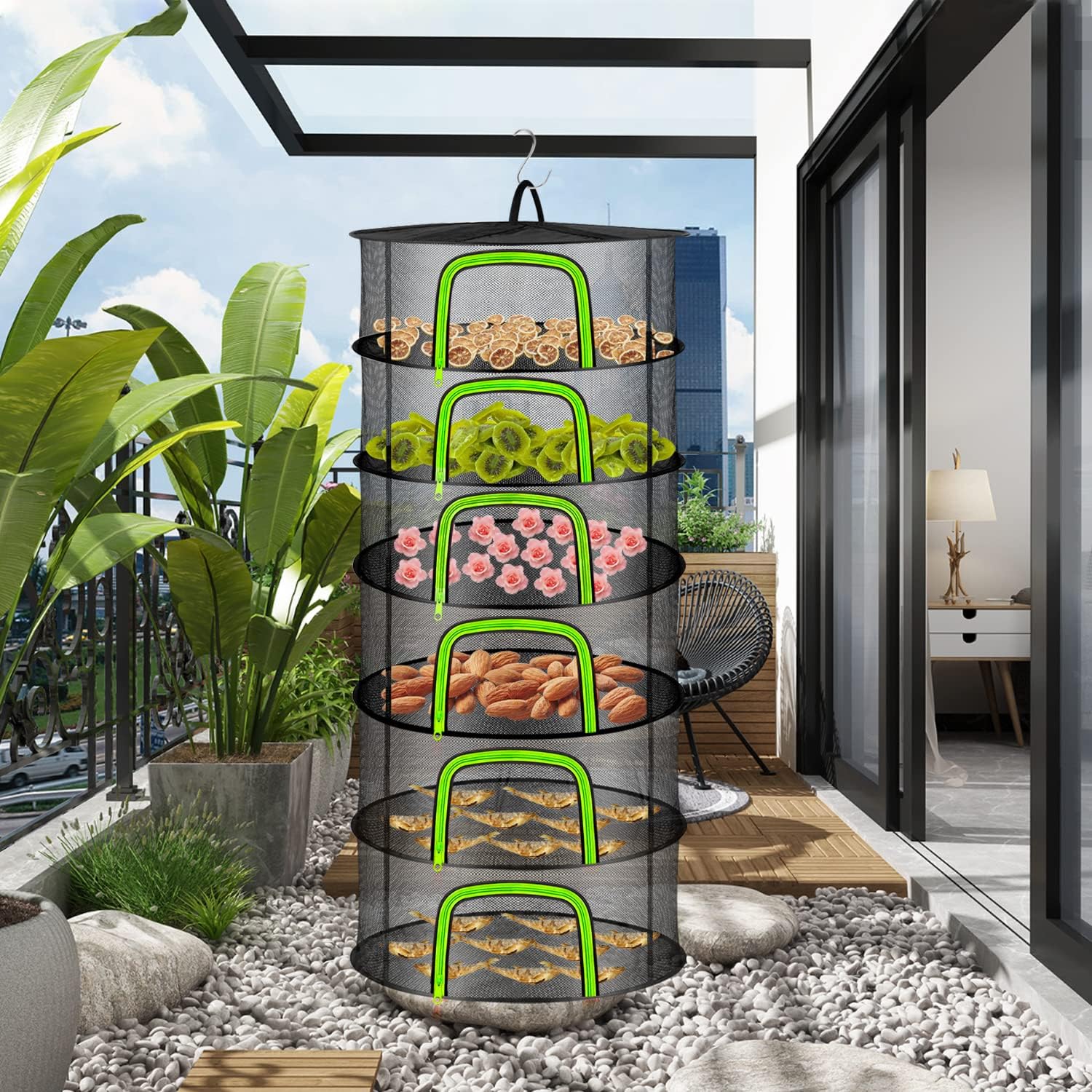 • 🌞【6 LAGIGE GROssE KAPAZITAT】 6-lagiges Netz-Abtropfgestell zum Aufhängen von Kräutern Trockennetz, der aufgeklappte Durchmesser beträgt 60 cm, die Höhe jeder Schicht beträgt 20 cm und die Gesamthöhe beträgt 120 cm. Jede Etage bietet viel Platz, um viele Pflanzen und Kräuter zu trocknen. Jede Schicht hat einen unabhängigen Reissverschluss, der sortiert und getrocknet werden kann, um ein Vermischen zu vermeiden. Das vertikale Design nutzt den Platz sehr effizient.