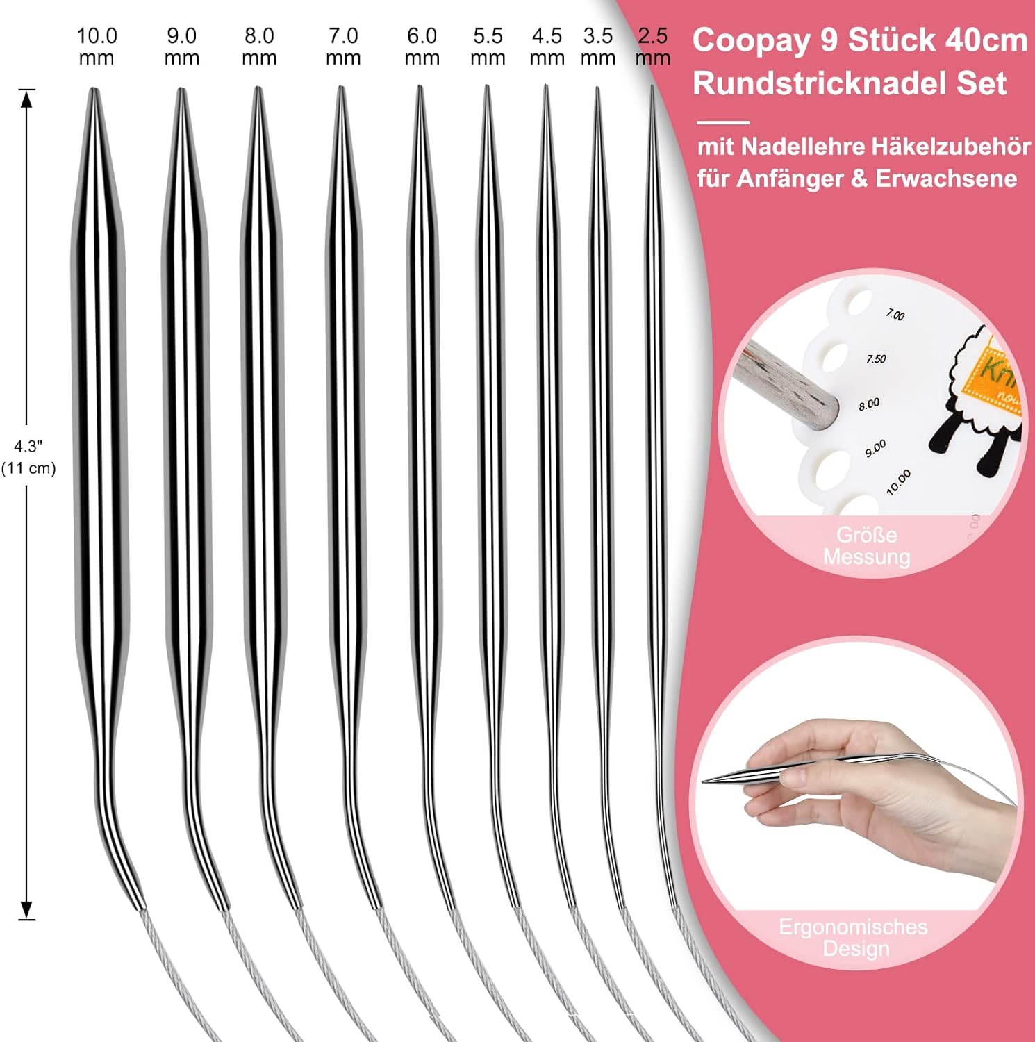 - [Professionelle Rundstricknadeln 40 cm] Das komplette Stricknadeln Rundstricknadel Set enthält 9 Stück Stricknadeln Rundstricknadel in verschiedenen Grössen (2,5 mm, 3,5 mm, 4,5 mm, 5,5 mm, 6,0 mm, 7,0 mm, 8,0 mm, 9,0 mm, 10,0 mm), Runden Nadellehre