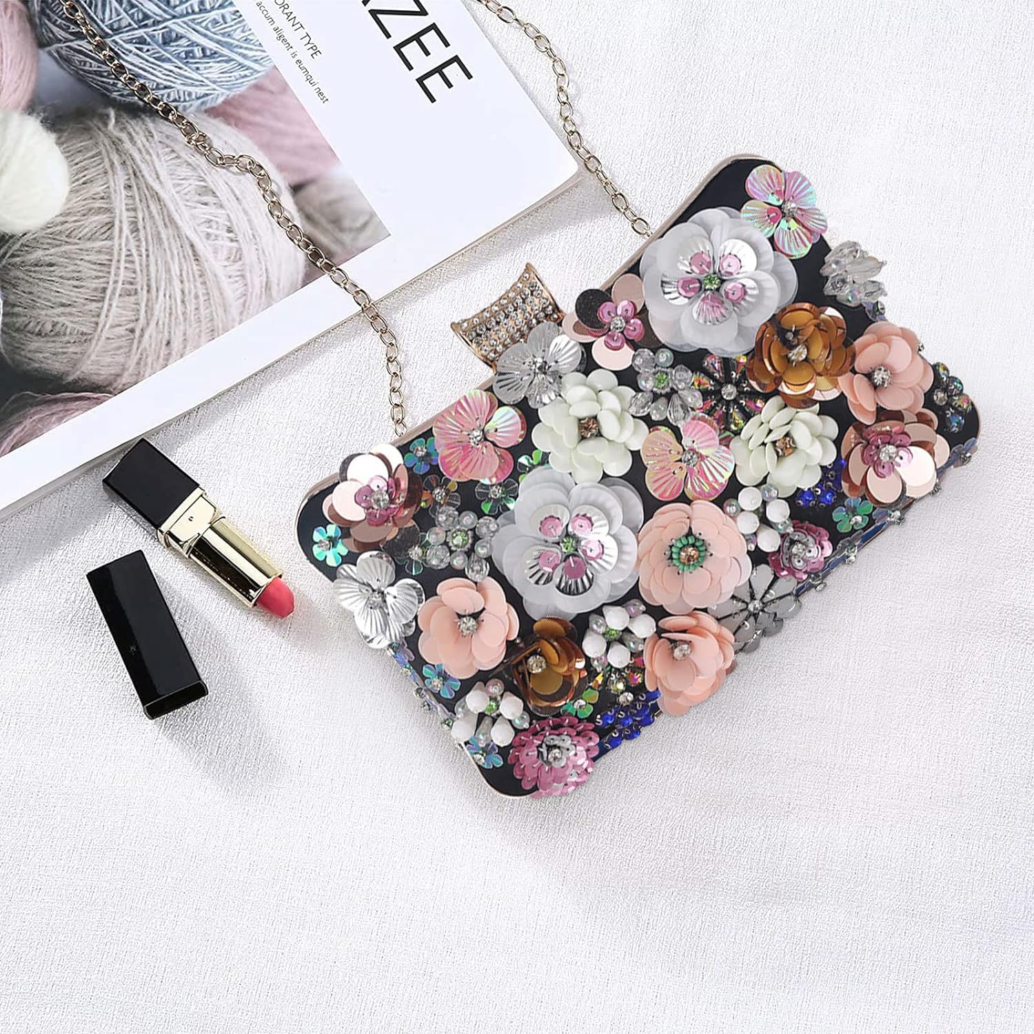 - ❉Handgefertigtes Blumendesign: Diese Blumen-Abend-Clutch-Geldbörse wurde mit 3D-Simulationsblumen entworfen, die mit polierten goldenen Metallbeschlägen und Metallblumen und -perlen verziert sind. Das Design ist wunderschön, schön und praktisch, um