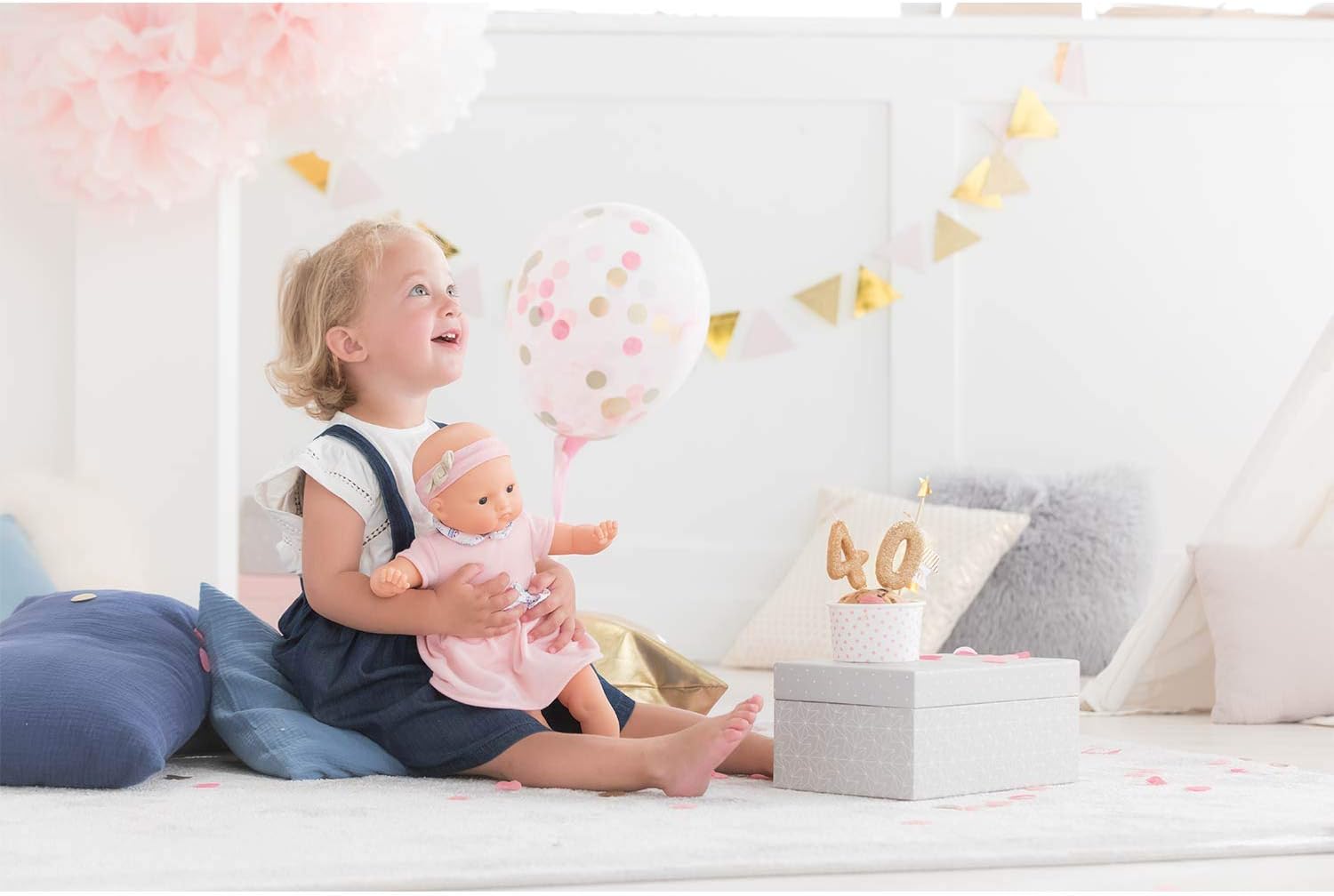 - 40 Jahre Corolle: die Weichkörperpuppe trägt ein süsses Geburtstagsoutfit mit Stirnband anlässlich des 40-jährigen Corolle Jubiläums