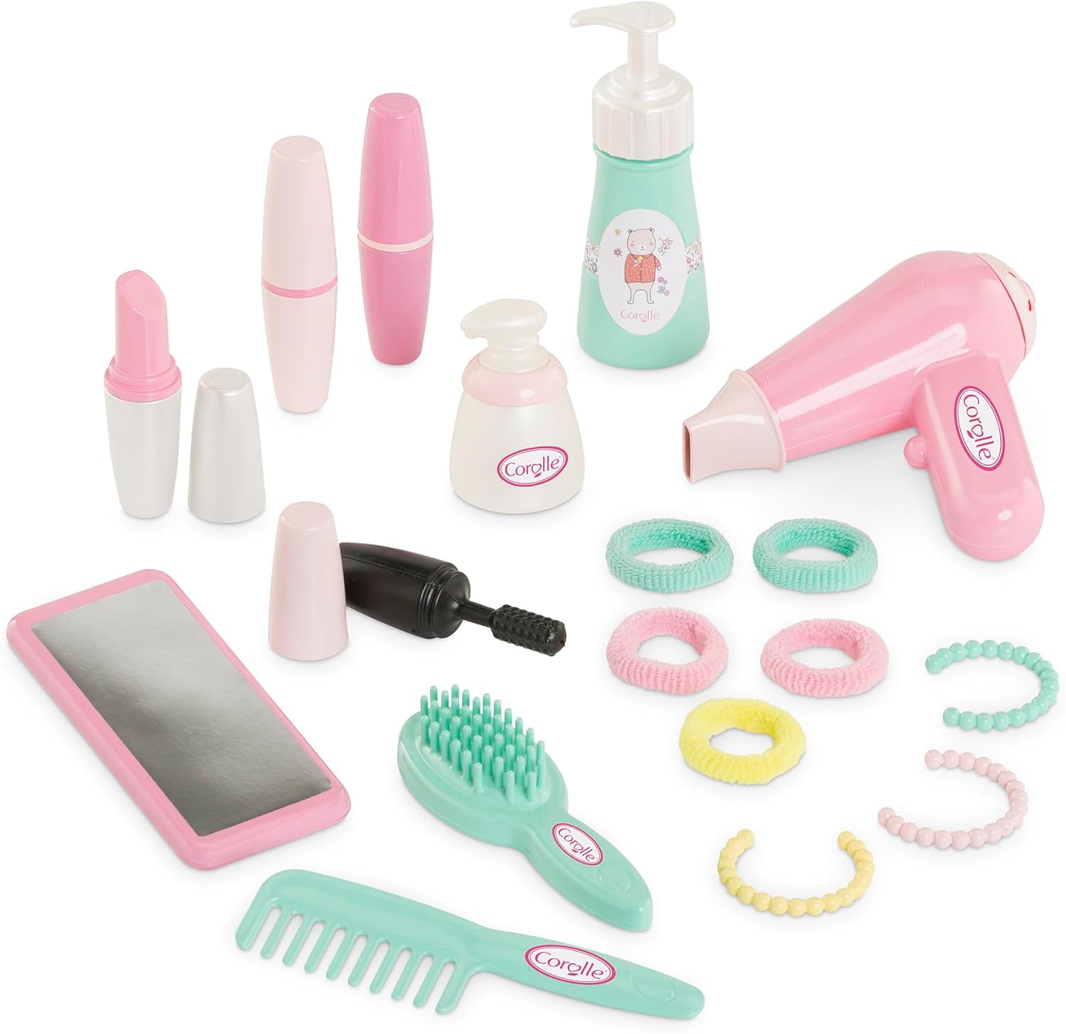 - 20 REALISTISCHE ZUBEHÖR: 1 künstliche Mascara, 3 künstliche Lippenstifte, 1 grosse und 1 kleine Lotion, 1 Bürste und 1 Kamm, 1 Dummy Haartrockner, 5 Haargummis, 3 farbige Armbänder, 1 Spiegel, 1 Bogen mit 5 Aufklebern zum Personalisieren des