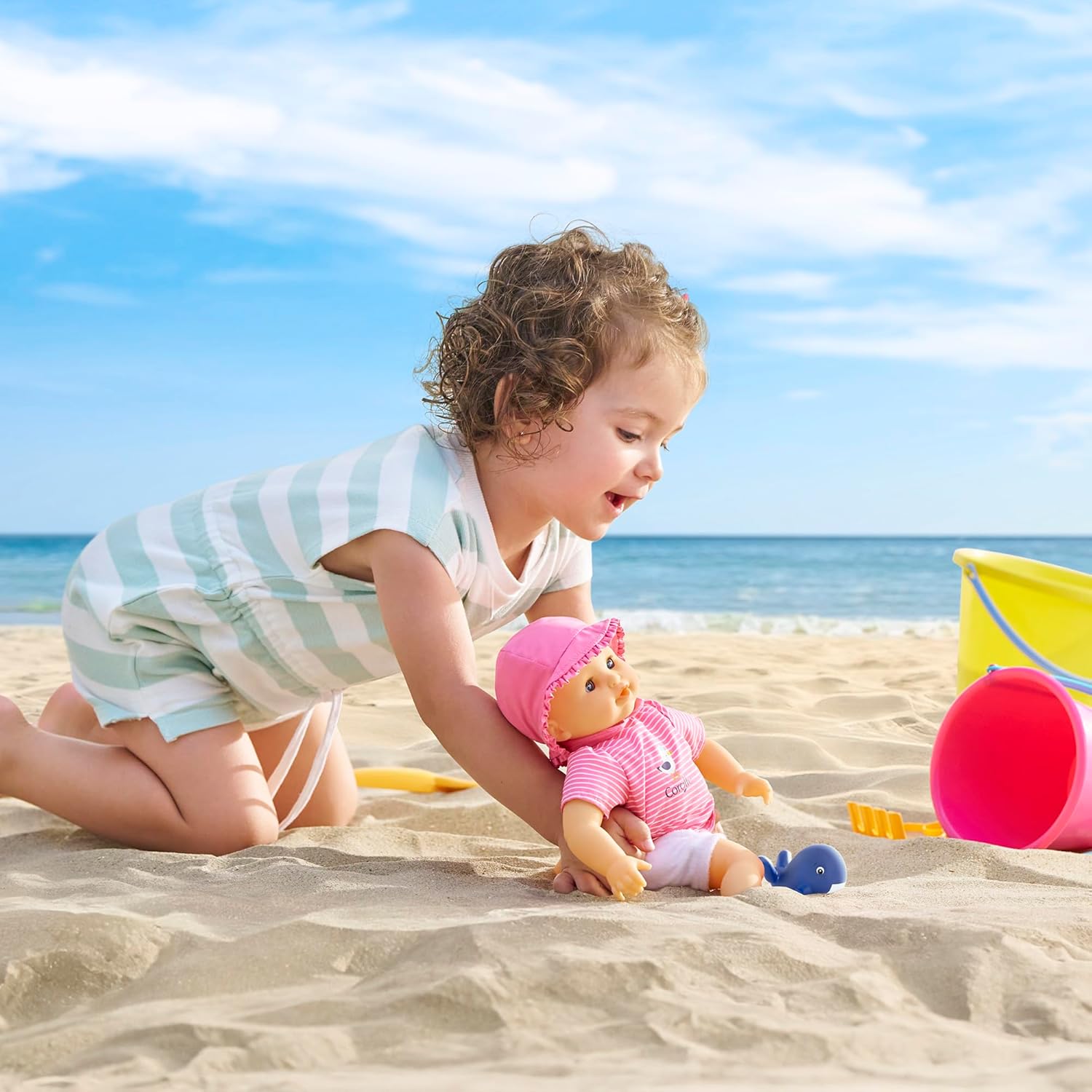 • Weichkörper-Badepuppe - die 30cm grosse Badepuppe trägt ein süsses rosa-weisses Badeoutfit mit Sonnenhut, das auch ausgezogen werden kann. Für Kinder ab 18 Monaten geeignet.
