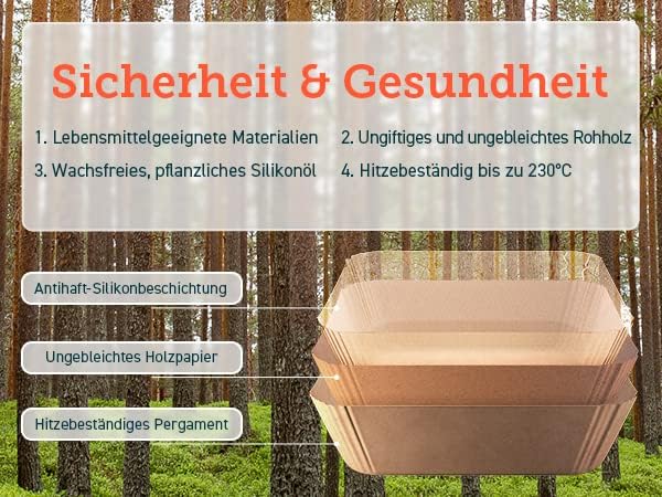 - 【Sicherheit und Gesundheit】COSORI Backpapiere sind aus wachsfreiem, ungiftigem und ungebleichtem Material in Lebensmittelqualität hergestellt und können bis zu 230℃ erhitzt werden, der höchsten Temperatur in der Heissluftfritteuse.