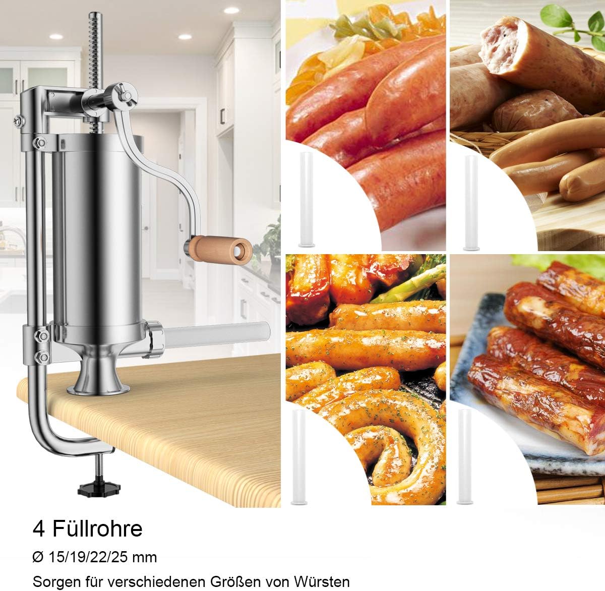 - 🍴【Wurst nach Geschmack machen】Mithilfe 4/6 unterschiedliche Füllrohre lässt die Wurstfüllmaschine Wurst in 4/6 individuellen Grössen einstellen, ermöglicht diverse Würste jederzeit machen.