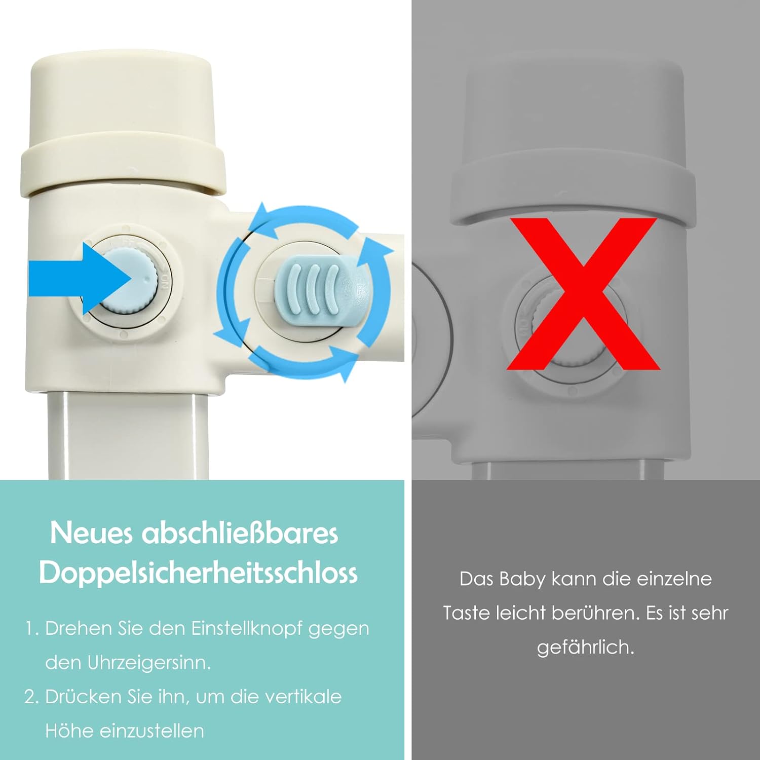 - 【Praktisches & separates Anheben】 Jede Seite des Gitters kann separat angehoben werden, daher kann das Kind leicht ins Bett einsteigen. Durch die doppelte Kindersicherung müssen Sie den Knopf zum Verstellen drücken und gleichzeitig entgegen dem Uhrzeigersinn drehen. Daher kann das Kind das Gitter nicht versehentlich herunterklappen.