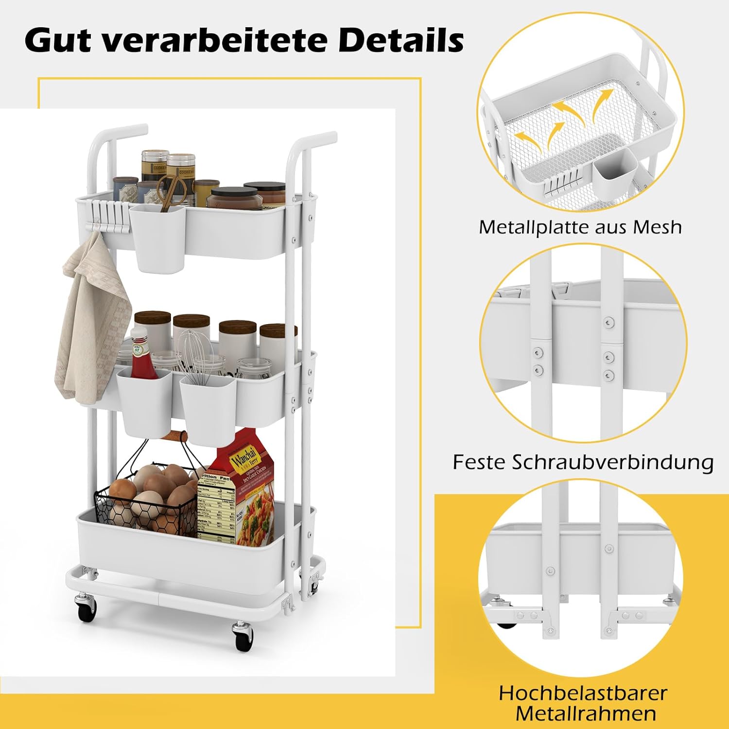 - 【3-stöckiger, grosszügiger Stauraum】Maximieren Sie Stauraum und Ordnung mit diesem Rollwagen. Mit 3 grossen Etagen, 3 Hängebechern und 6 Haken ist unser Produkt perfekt zum Sortieren verschiedener Gegenstände.