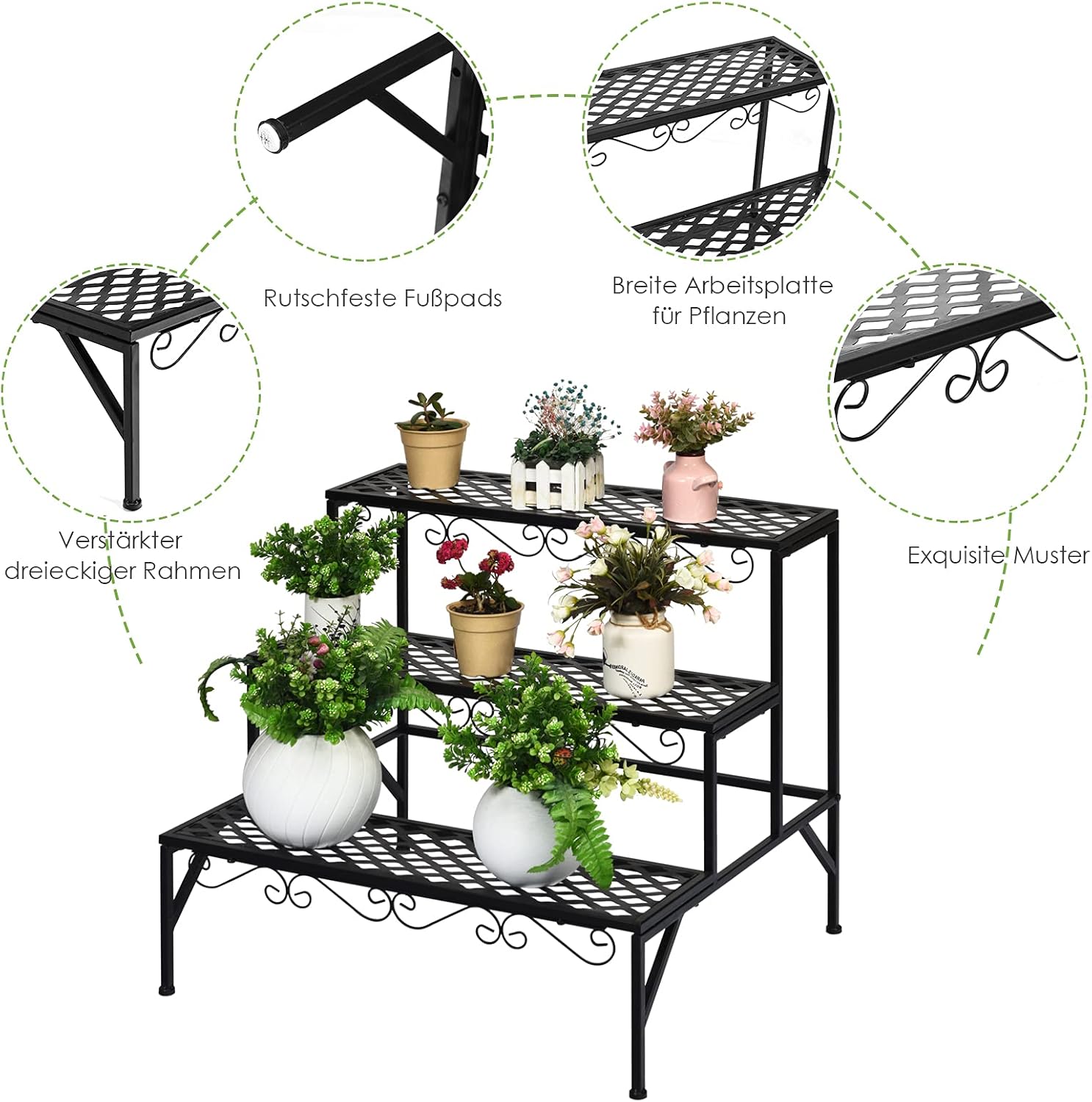 - 【3-stufige Pflanzenleiter】Durch die drei Ebenen bietet das Regal viel Platz für Toppflanzen. Durch das durchlässige Design kann sich kein Wasser ansammeln. Dank der Leiterstruktur bekommen alle Pflanzen genug Platz und Sonnenlicht.