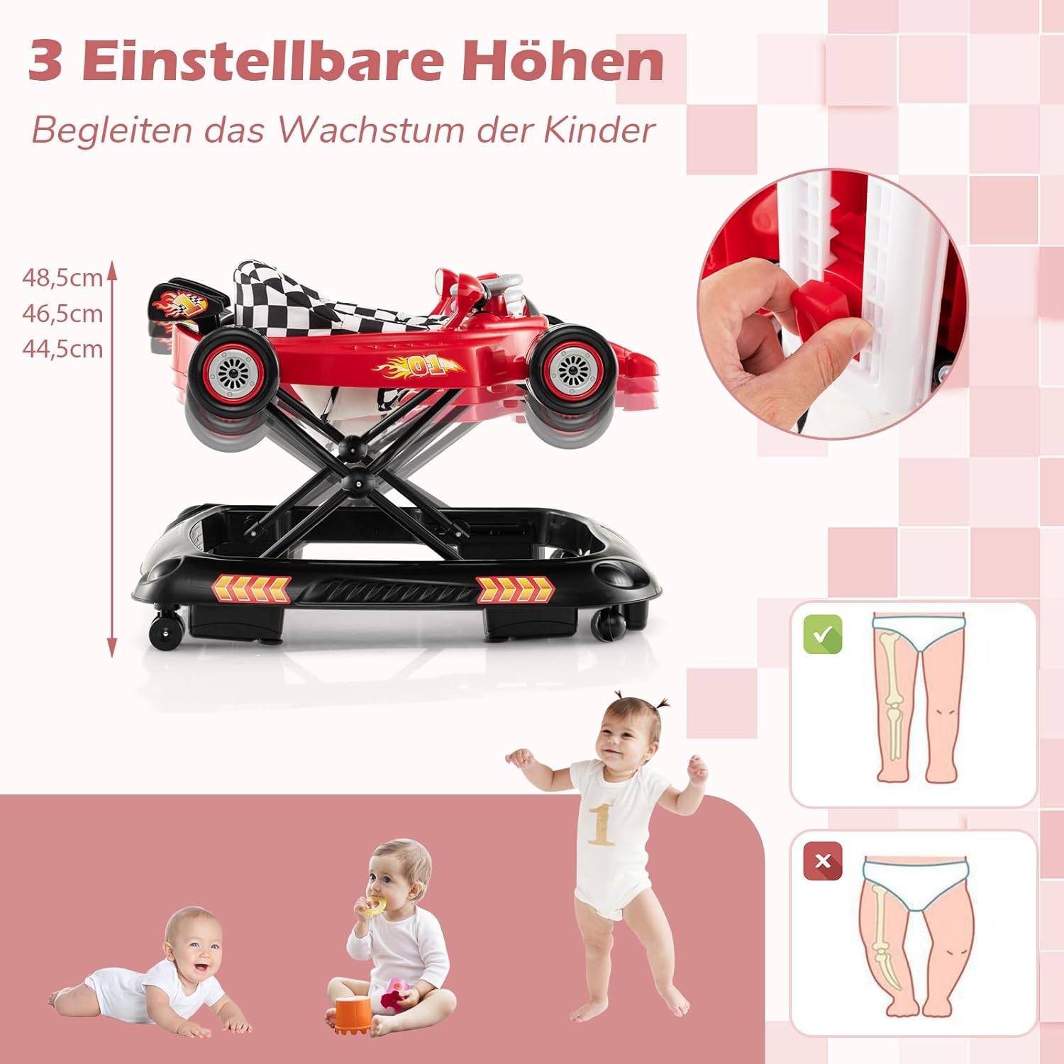 - đăVerstellbare Höhen fĂŒr das WachstumăDieses Baby Walker verfĂŒgt ĂŒber 3 verstellbare Höhenstufen (44,5 cm / 46,5 cm / 48,5 cm) und kann somit das Wachstum Ihres Kindes begleiten. Er kann in 4 Modi verwendet werden: Lauflernhilfe,
