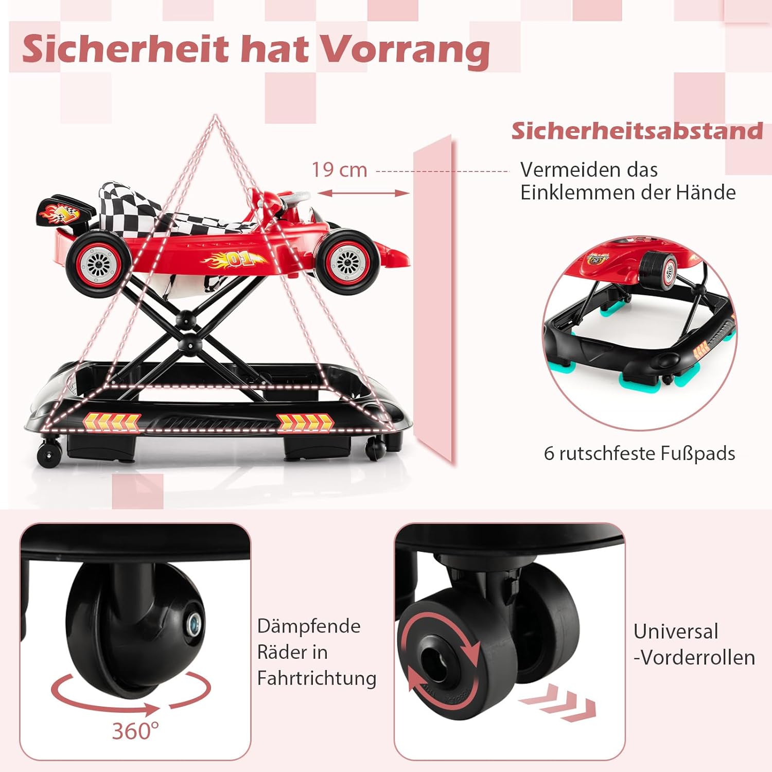 - đăSicherheit steht an erster StelleăDiese Gehhilfe fĂŒr Baby ab 6 Monaten hat einen Sicherheitsabstand von 19 cm, damit die HĂ€nde nicht stecken bleiben. Der stabile Rahmen und 6 rutschfeste Fusspolster am Boden sorgen fĂŒr StabilitĂ€t und