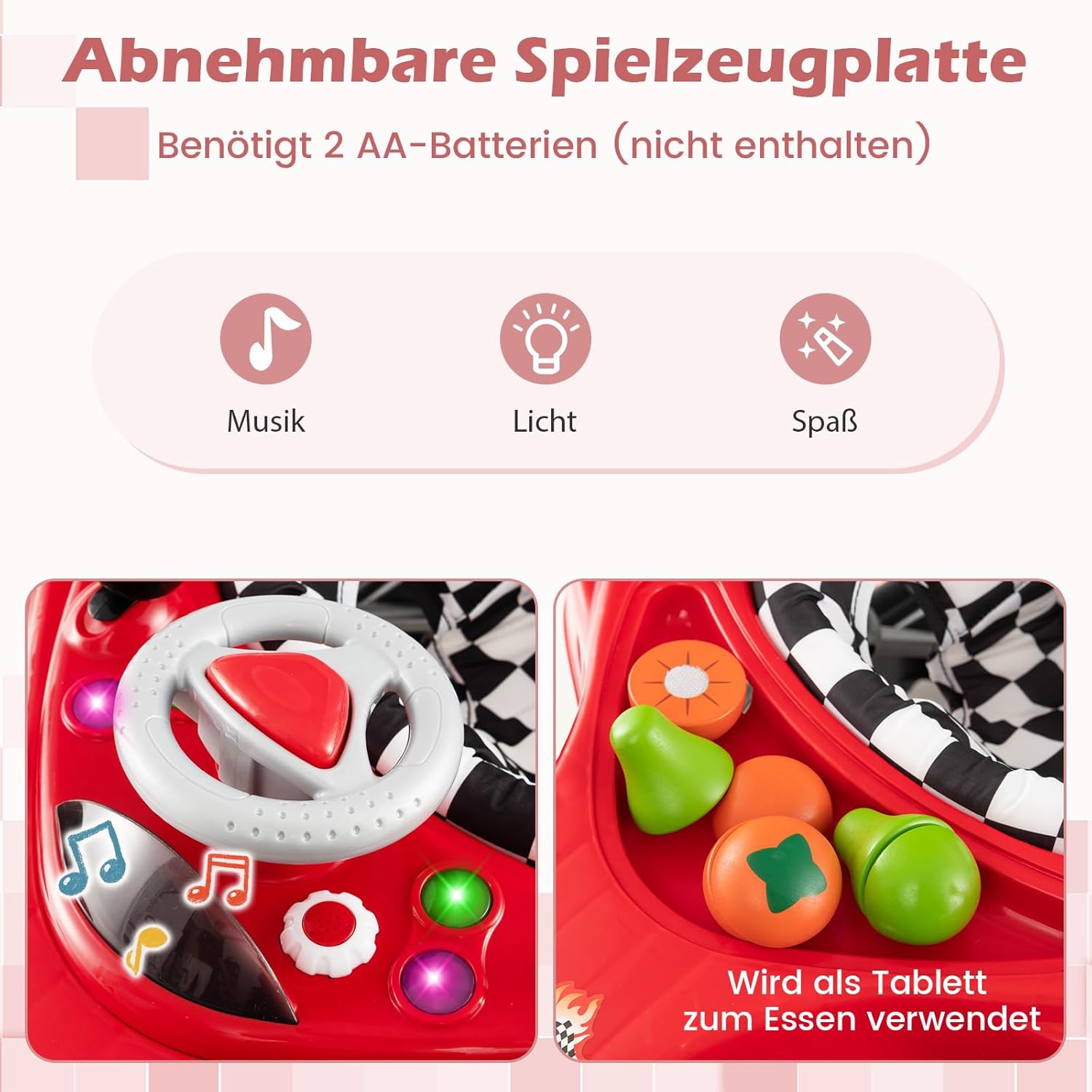 - đ”ăInteraktive FunktionenăDieser Lauflernwagen im Rennwagendesign verfĂŒgt ĂŒber RĂŒckspiegel, Lenkrad und Hupe, Schalthebel und dekorative RĂ€der, die Kinder zum Erkunden ermutigen. Das Musiktablett mit Lichtern und Lautsprecher kann die auditiven