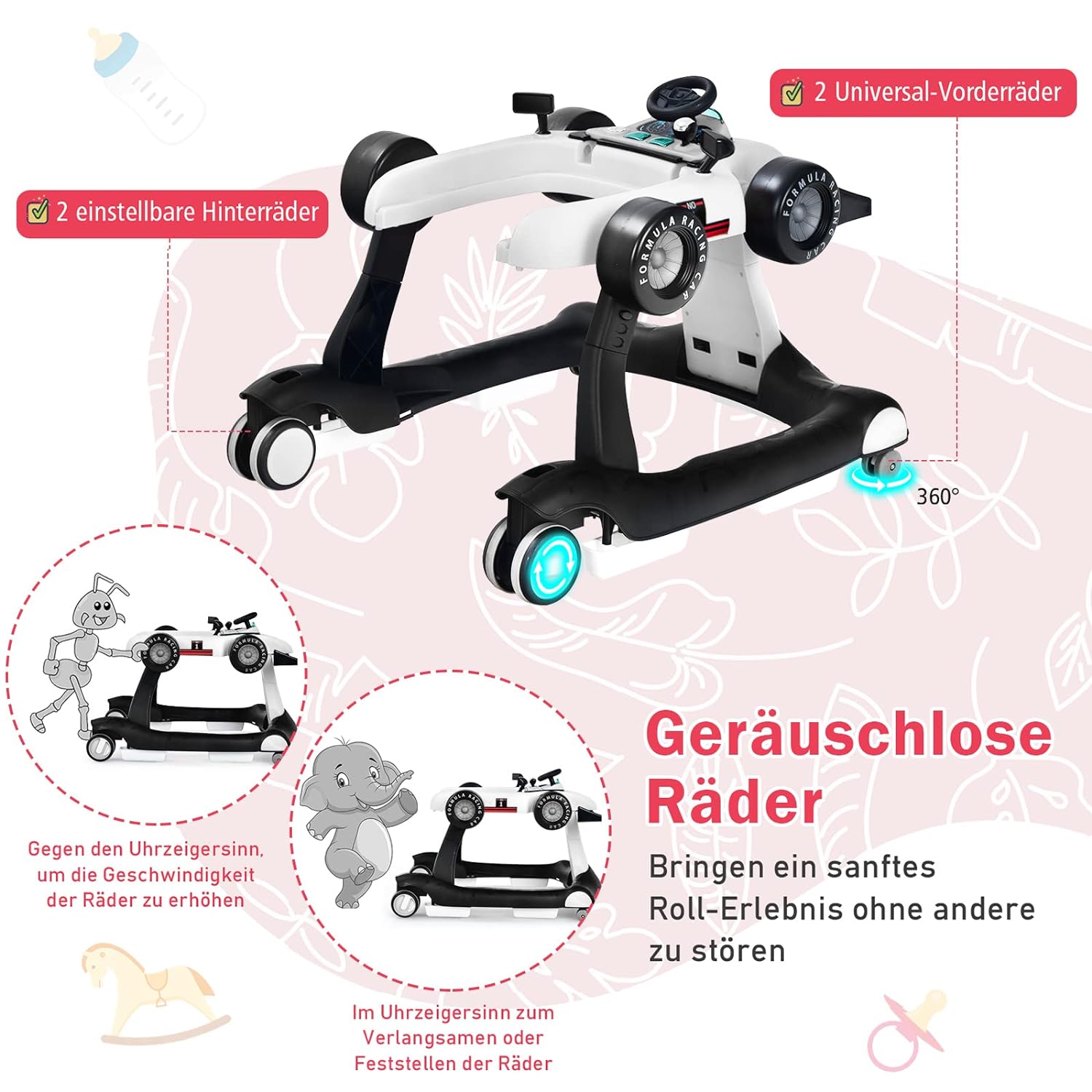 - 🚘【Einstellbare Höhe & Tempo】Die Lauflernhilfe hat 3 Höhenstufen, die je nach Grösse des Kindes eingestellt werden können. Die beiden Vorderräder sind geräuschlose Universalräder, die die Richtung ändern können, und die Geschwindigkeit