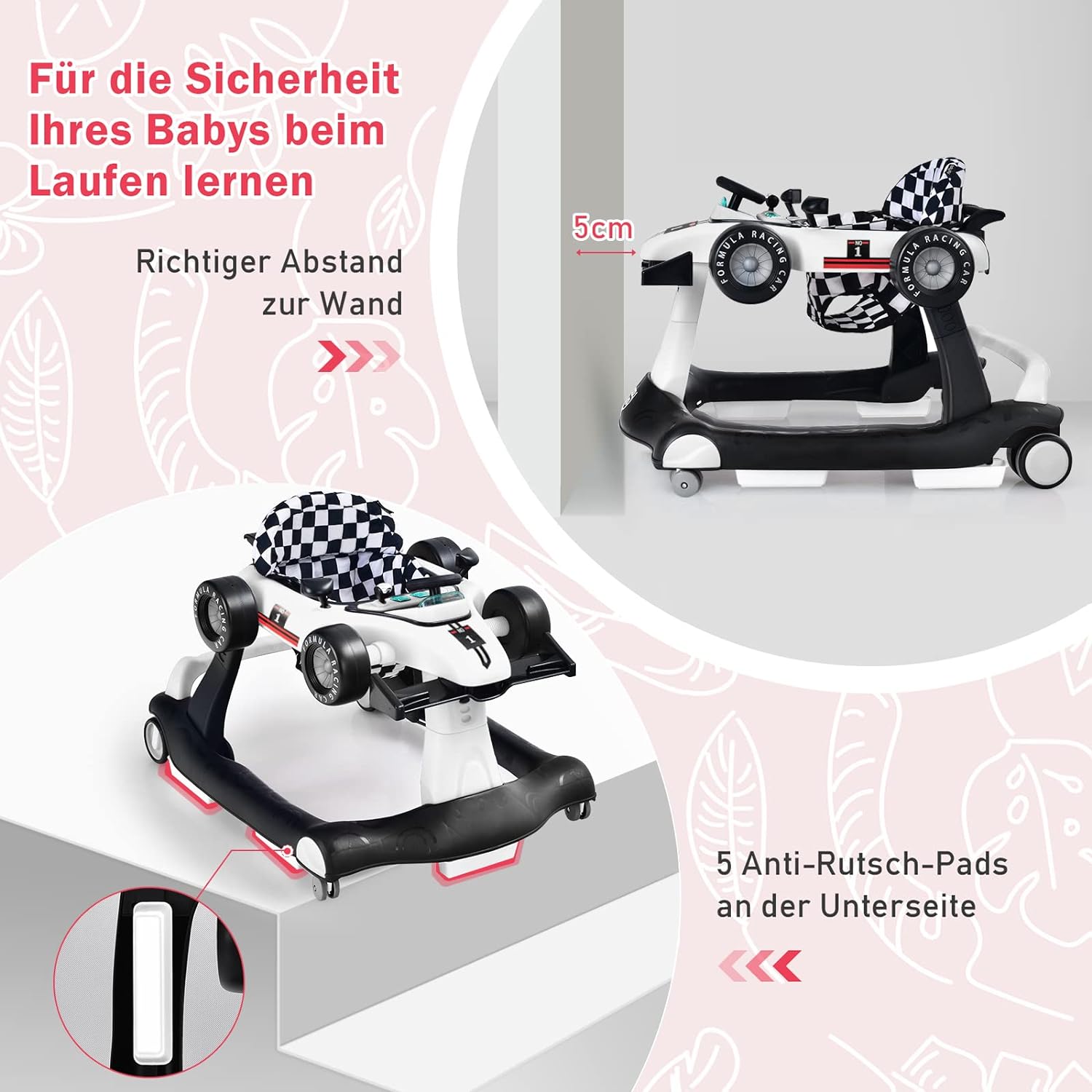 - 🚘【Für Sicherheit & Komfort】Die Lauflernhilfe ist mit einer Kopfstütze versehen, die den Kopf des Kindes schützt. Die 5 Anti-Rutsch-Pads an der Unterseite und 4 rutschfesten Räder tragen zur Sicherheit Ihrer KInder bei. Zudem ist der Sitzbezug