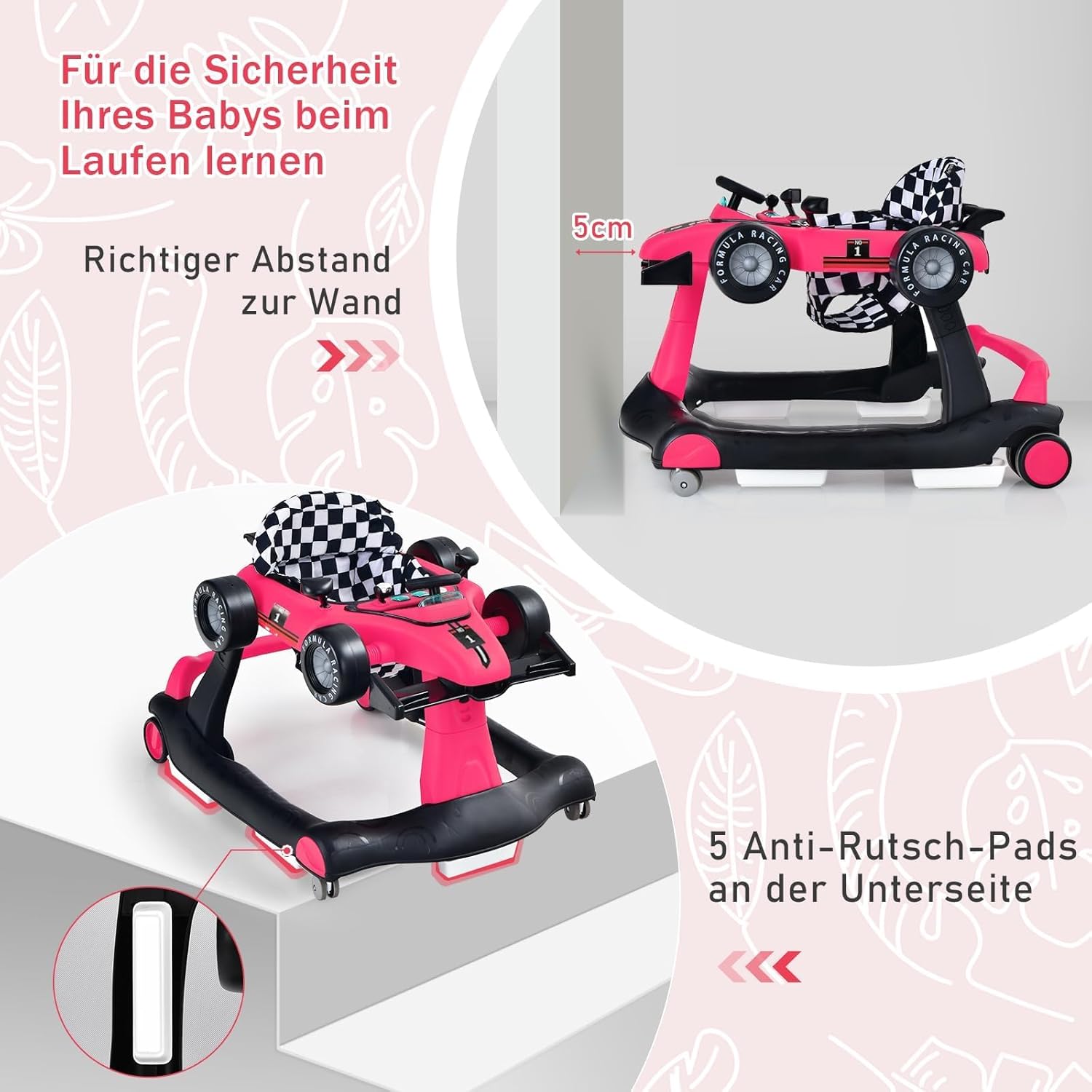 - đăInteraktives autoförmige DesignăDie Gehhilfe hat ein Lenkrad, GĂ€nge, 2 Lichtknöpfe und 2 Spiegel, wodurch sie wie einen kleinen Babykart aussieht. Ausserdem kann Musik abgespielt werden und es werden 2 AA Batterien (nicht inklusive) benötigt.