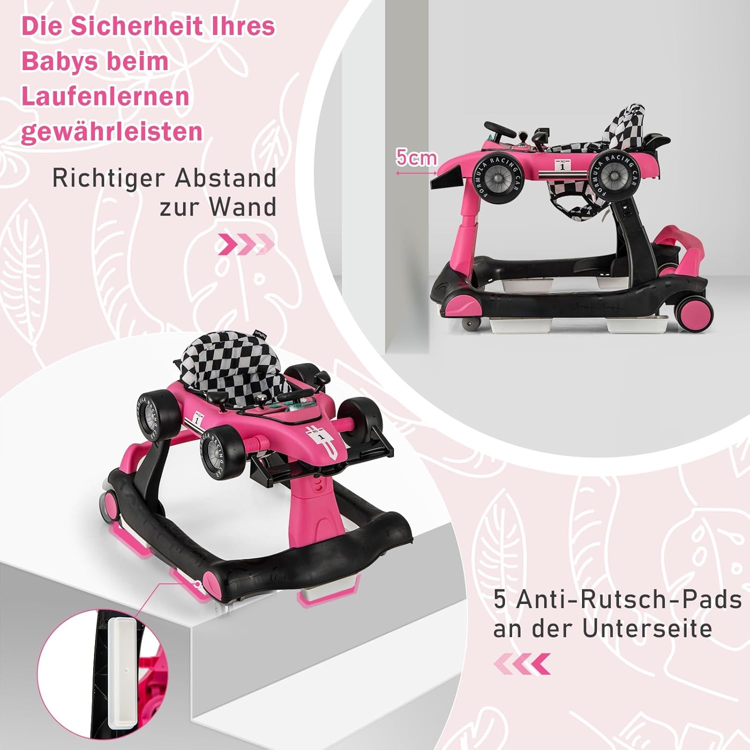 - đăFĂŒr Sicherheit & KomfortăDie Lauflernhilfe ist mit einer KopfstĂŒtze versehen, die den Kopf des Kindes schĂŒtzt. Die 5 Anti-Rutsch-Pads an der Unterseite und 4 rutschfesten RĂ€der tragen zur Sicherheit Ihrer KInder bei. Zudem ist der Sitzbezug