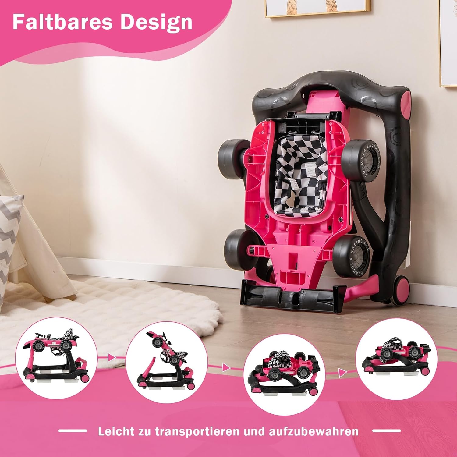 - đăPlatzsparendes DesignăDurch ihre Klappstruktur kann die Lauflernhilfe bei Nichtgebrauch leicht an der Wand oder platzsparend unter dem Bett oder Sofa verstaut werden.