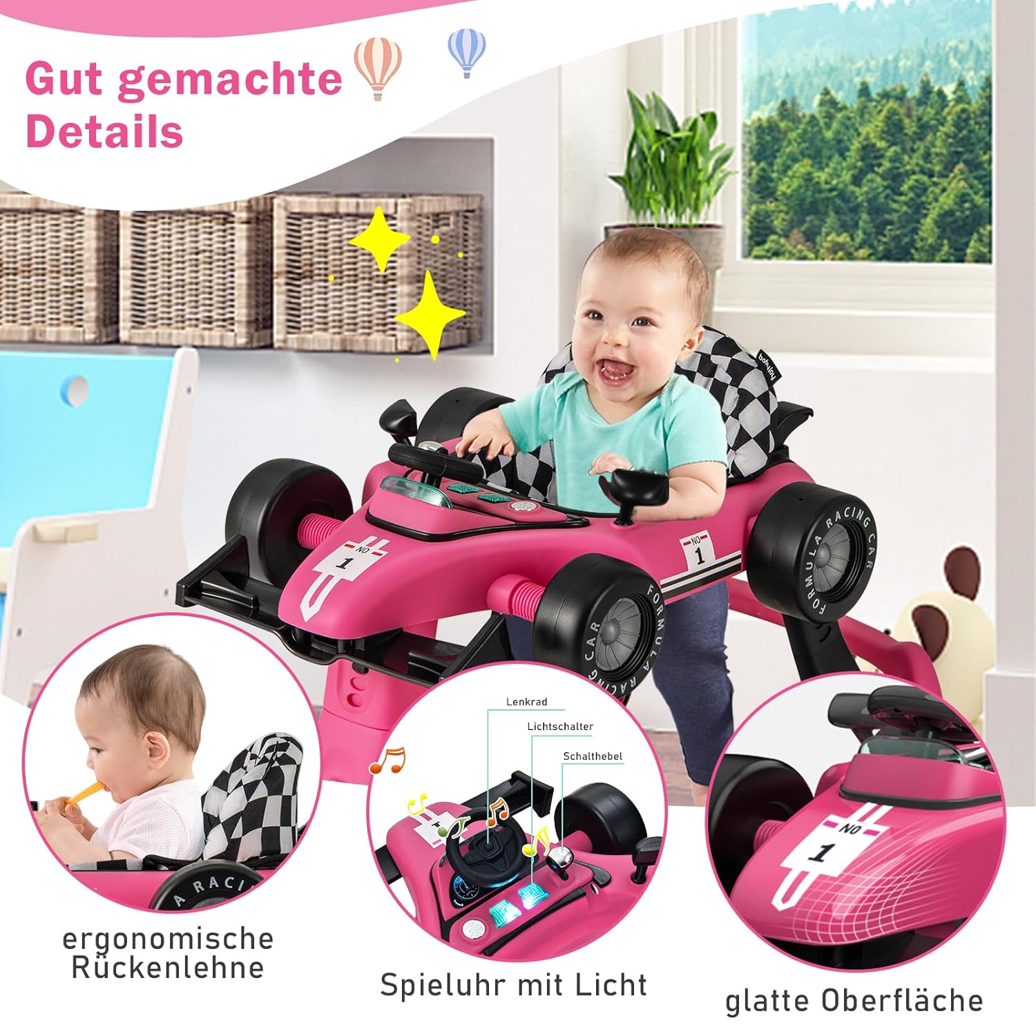 - đăInteraktives DesignăDie Lauflernhilfe hat ein Lenkrad, GĂ€nge, 2 Lichtknöpfe und 2 Spiegel, wodurch sie wie einen kleinen Babykart aussieht. Ausserdem kann Musik abgespielt werden und es werden 2 AA Batterien (nicht inklusive) benötigt.