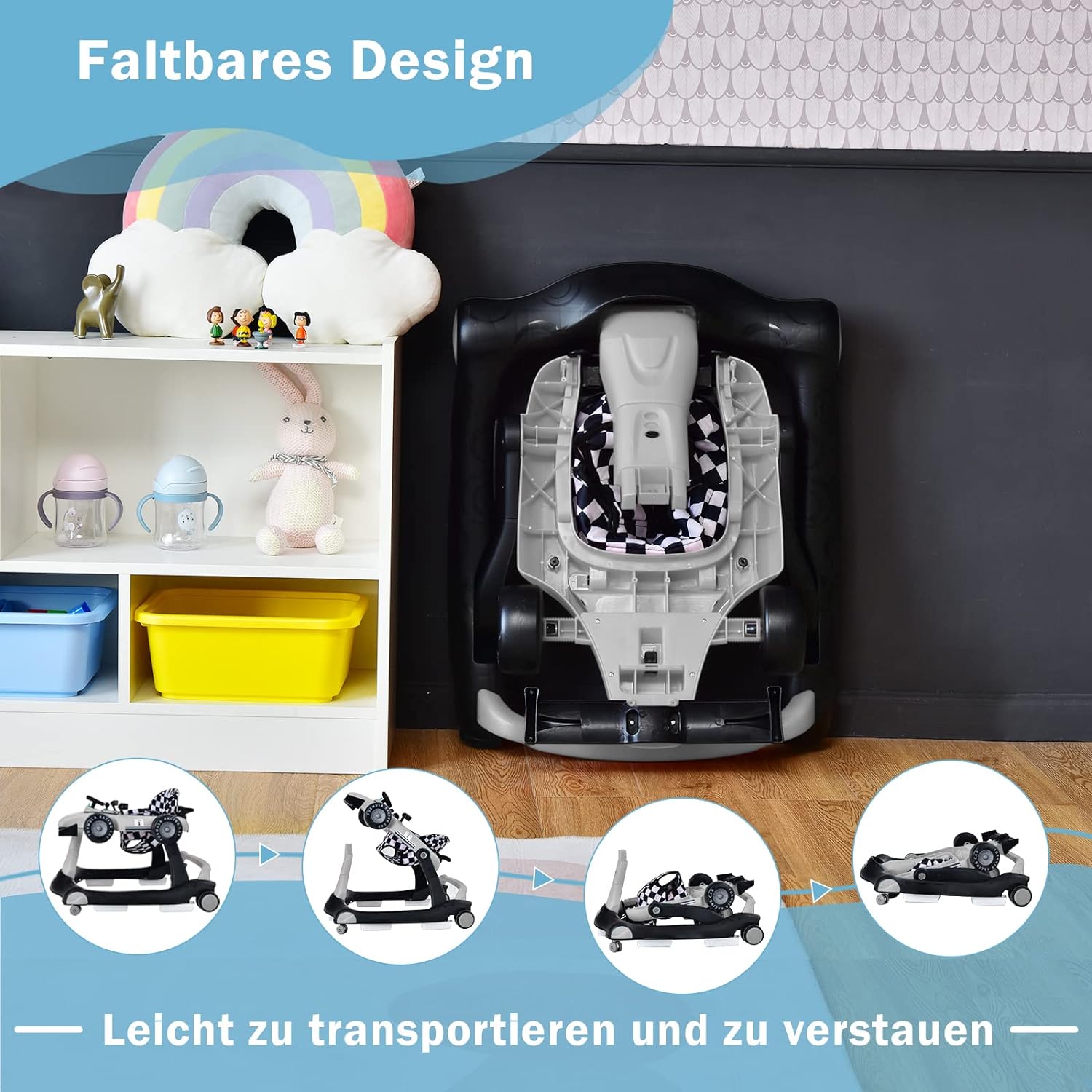 - 🚘【Platzsparendes Design】Durch ihre Klappstruktur kann die Lauflernhilfe bei Nichtgebrauch leicht an der Wand oder platzsparend unter dem Bett oder Sofa verstaut werden.