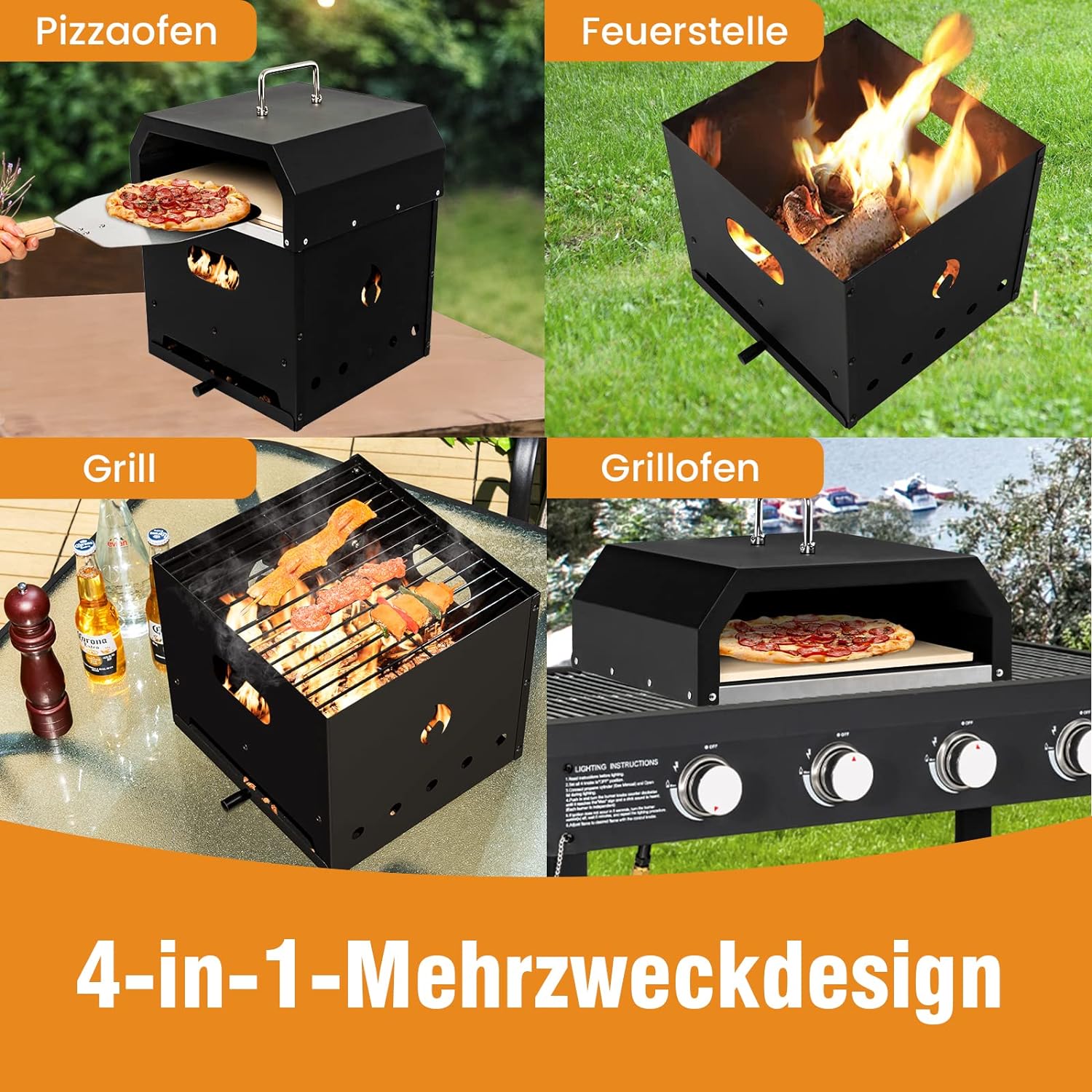 - 【Komplettes Zubehör und schnelle Montage】Dieser 4-in-1-Pizzaofen für den Aussenbereich wird mit umfangreichem Zubehör geliefert, darunter ein Pizzastein, eine Pizzaschaufel, ein Grillgitter und eine wasserdichte Oxford-Stoffabdeckung. Darüber