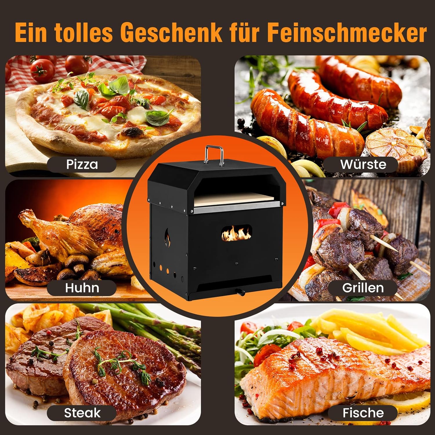 - 【Mehrere Brennstoffoptionen】Dieser Outdoor-Pizzaofen mit separater Feuerstelle ist mit Holzpellets, Brennholz und Holzkohle kompatibel. Die Belüftungsöffnungen auf beiden Seiten erleichtern die Luftkonvektion, um einen besseren Verbrennungseffekt