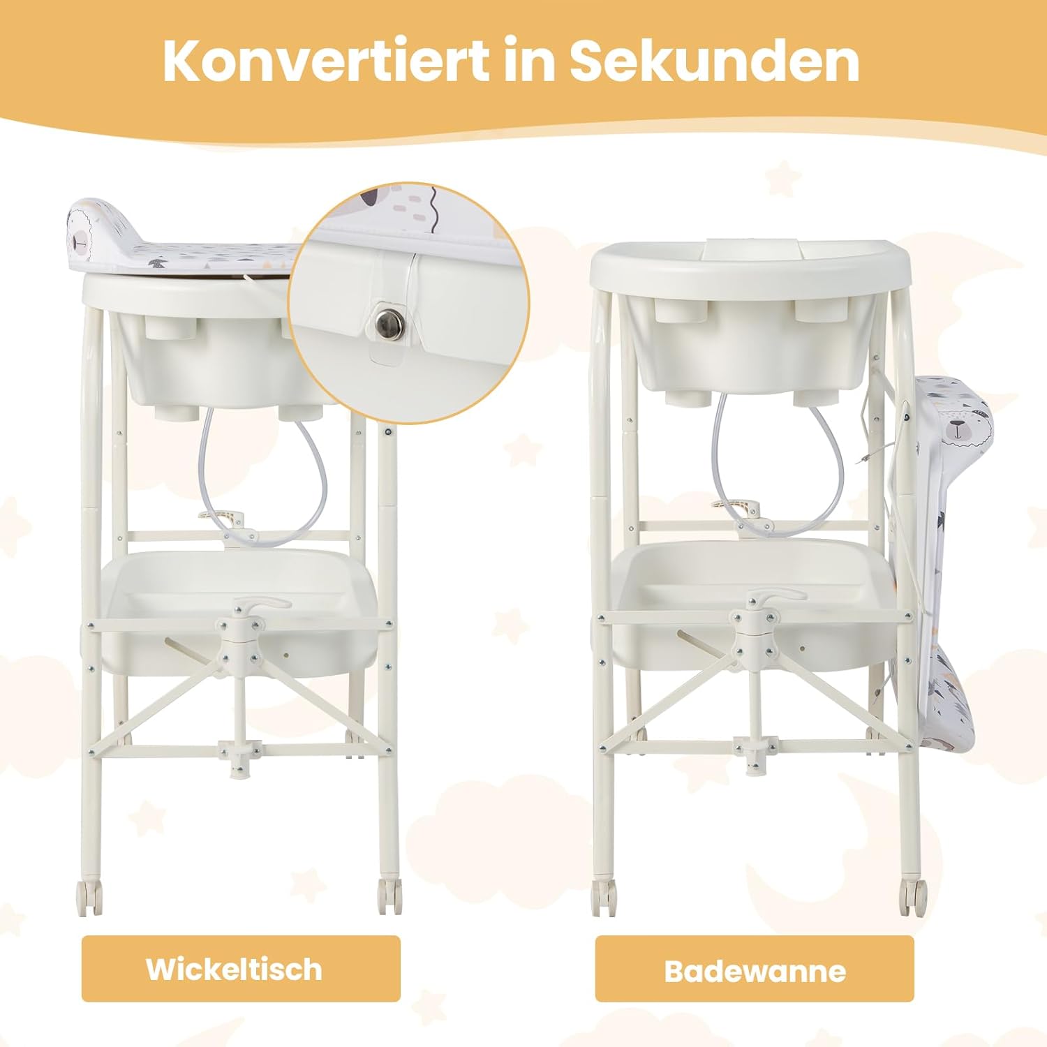 - 👶【Leicht zu bewegen & falten】Die Wickelkommode ist mit 4 Universalrädern mit Bremssystem, die für eine einfache Mobilität sorgen und gleichzeitig Stabilität und Sicherheit bieten. Ausserdem lässt sich die Wickelstation mit nur 4 Schritten