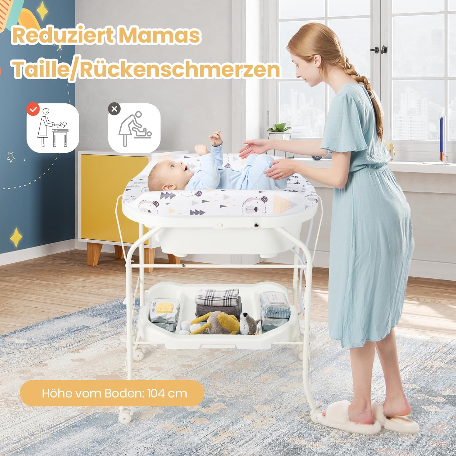 - 👶【Ergonomisches Design】Der Windeltisch hat eine Höhe von 100 cm und wurde mit Rücksicht auf die Gesundheit der Eltern entwickelt. Beim Wickeln oder Baden des Kindes braucht man sich nicht mehr bücken, was die Wirbelsäule der Eltern schont.
