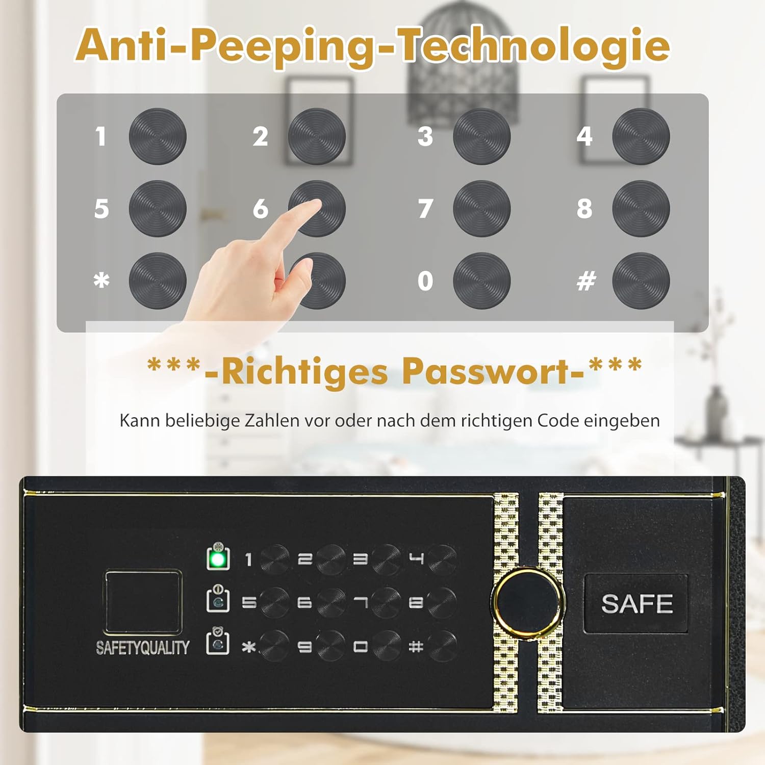 - đăZuverlĂ€ssiges AlarmsystemăDurch das zuverlĂ€ssige Alarmsystem ertönt bei drei falschen Eingaben oder starken Vibrationen ein Alarm und ein rotes Licht blinkt auf. Ausserdem ist es erwĂ€hnenswert, dass die Anti-Peeping-Technologie es Ihnen ermöglicht, eine beliebige Zahl vor und nach dem richtigen Code einzugeben, um das Erraten des Passworts zu verhindern.