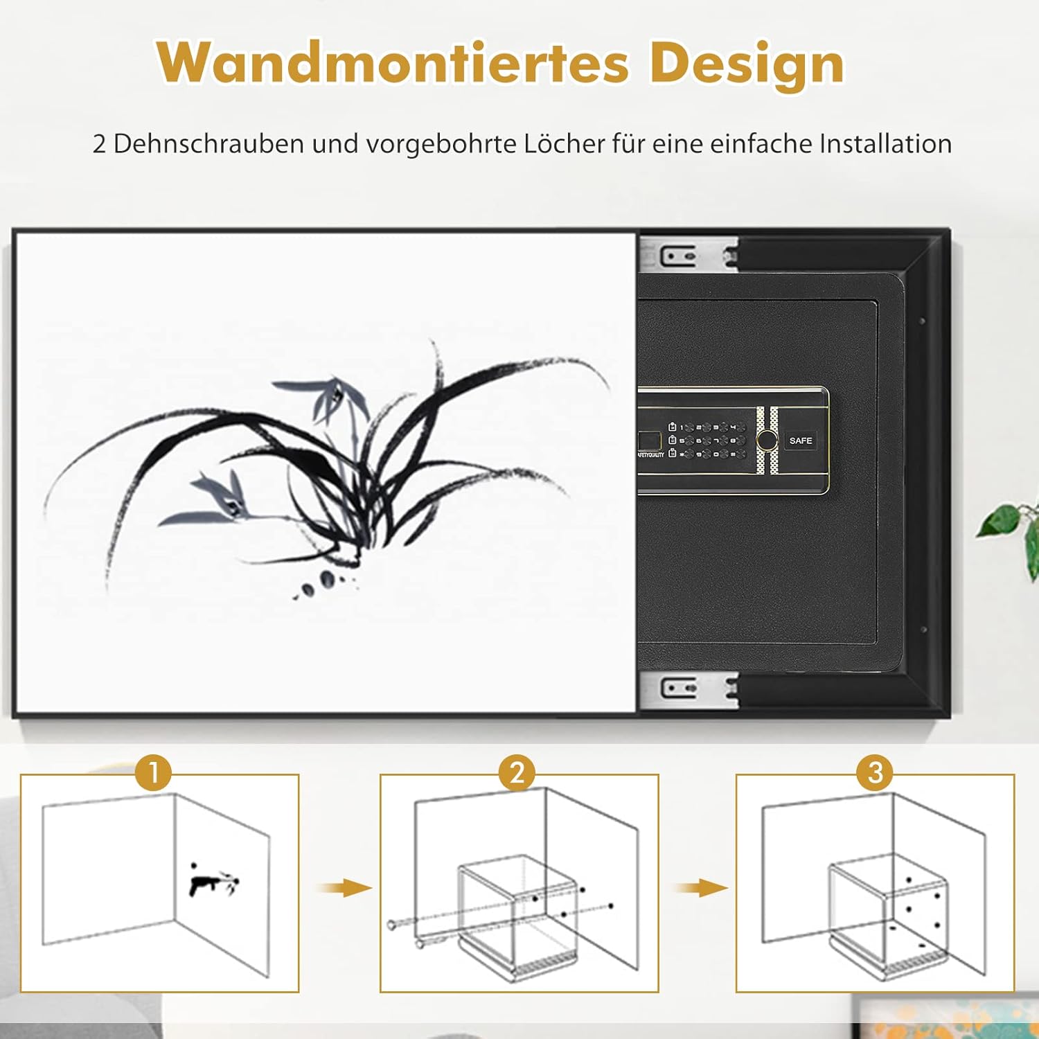 - đăPraktischer AufbauăDurch die zwei Bolzen lĂ€sst sich der Tresor sicher an der Wand oder im Schrank anbringen. Zudem sorgen die rutschfesten FĂŒsse fĂŒr StabilitĂ€t. Die kompakte und sichere Box eignet sich fĂŒr BĂŒros, zuhause, GeschĂ€fte, etc.