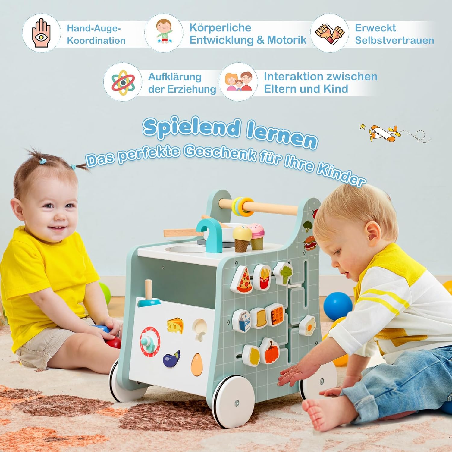 - 🥘【6-in-1-Mehrzweckdesign】Dieses Aktivitätszentrum dient als Lauflernwagen, Spielküche, Spielzeugbox, Lernuhr, Formanpassungsspiel und beweglicher Essensschieber. Das 6-in-1-Design erfüllt die unterschiedlichen Bedürfnisse von Kindern und