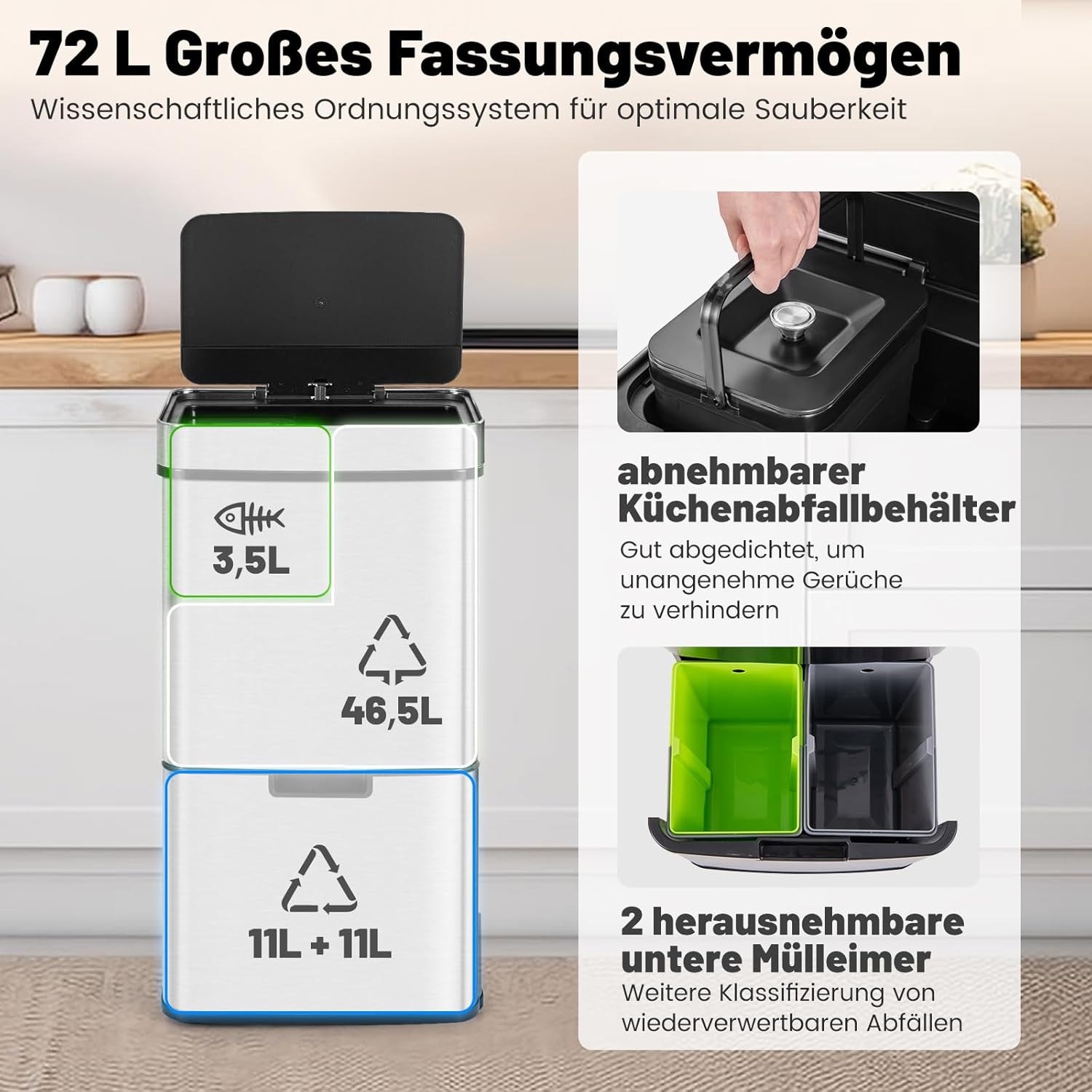 - 【Zusätzlicher Küchenabfallbehälter】Der Mülleimer enthält ein oberes Fach mit 46,5 Litern Fassungsvermögen und einen herausnehmbaren Küchenabfallbehälter mit 3,5 Litern Fassungsvermögen, mit dem Sie Küchenabfälle effektiv entsorgen können.