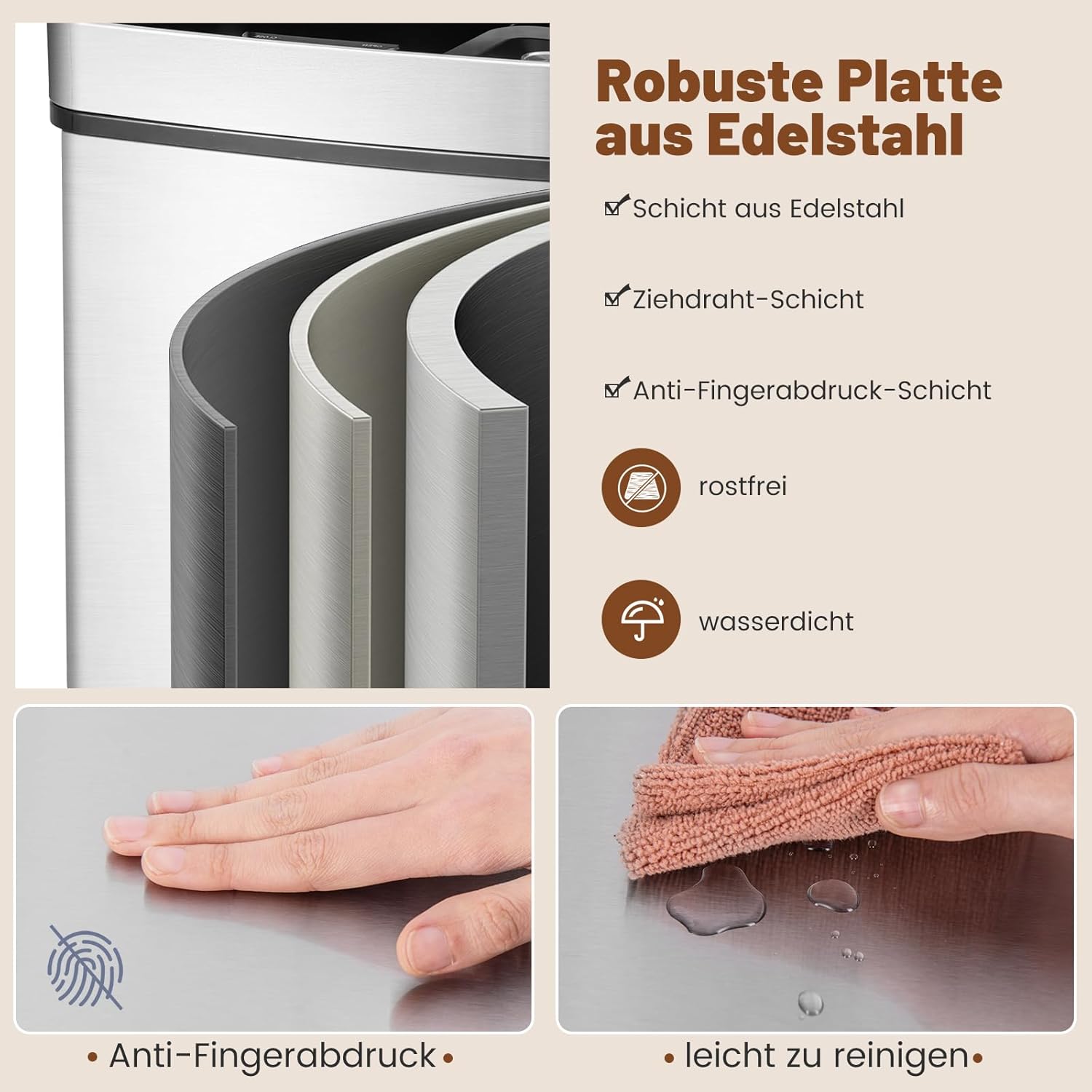 - 【3-lagiger Edelstahl】Eine einfache Reinigung wird durch die 3-lagige Edelstahlstruktur gewährleistet, die eine hohe Fingerabdruckresistenz und aussergewöhnliche Haltbarkeit bietet. Schliesslich ist der Abfallbehälter mit rutschfesten Fusspolstern