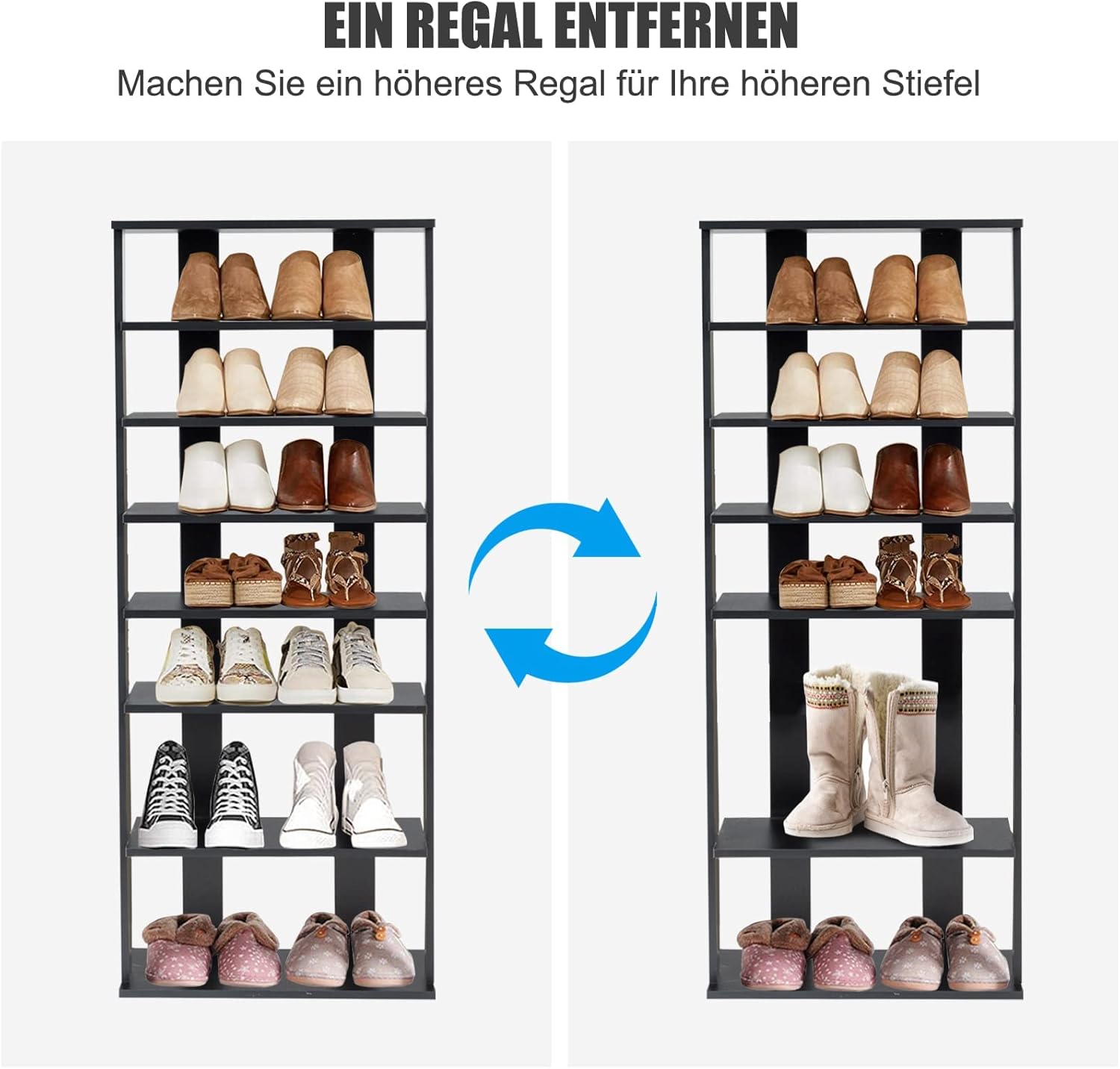 - 【Verschiedene Regalhöhen】Das Gestell ist mit 2 verschiedenen Höhen konzipiert und eignet sich für verschiedene Schuhe. Die Höhe der unteren beiden Etagen beträgt 19 cm und ist somit für hohe Absätze geeignet. Und die Höhe der oberen 5 Etagen