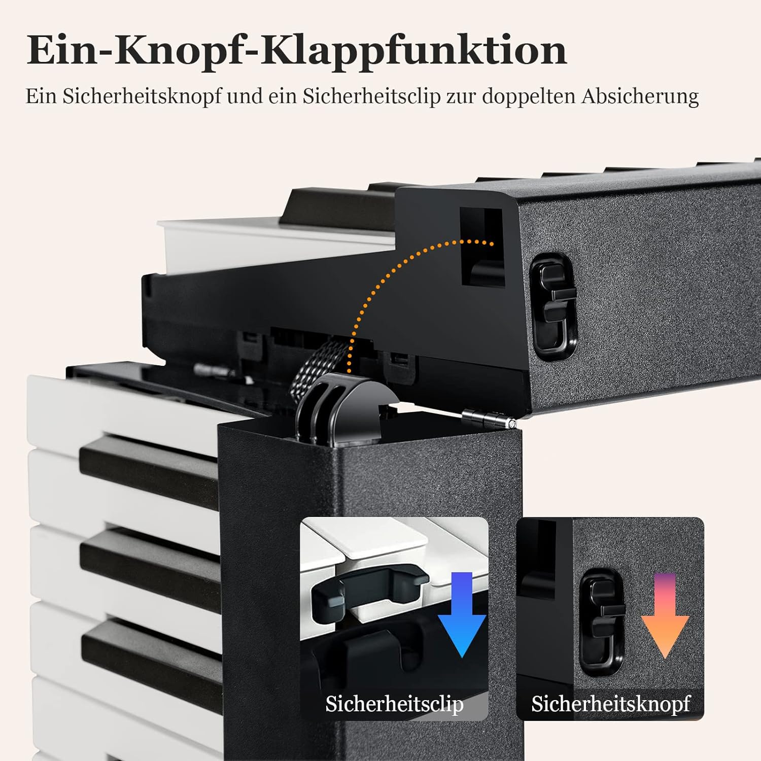 - 【Faltbares und tragbares Design】Im Gegensatz zu gewöhnlichen Keyboards kann unser Keyboard in zwei Hälften geklappt werden, um Platz zu sparen. Ein Sicherheitsknopf und ein Sicherheitsclip sollen eine doppelte Absicherung gewährleisten. Und es
