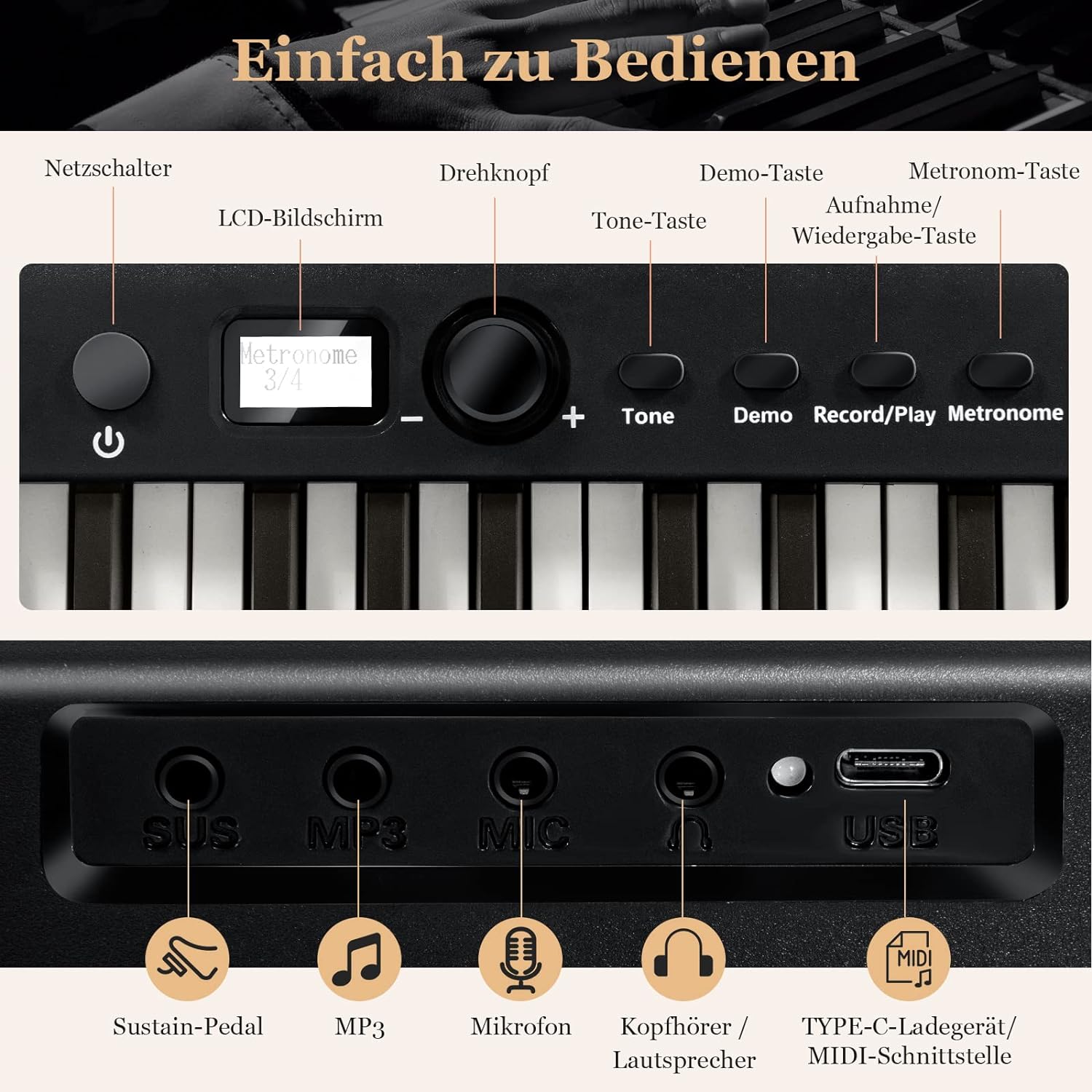 - 【Einfaches Aufladen und doppelte drahtlose Verbindung】Unsere elektrisches Keyboard mit eingebautem 1750-mAh-Akku kann mit einem 5-V-1-A-Netzteil aufgeladen werden. Darüber hinaus kann das Keyboard mit 5 externen Anschlüssen (einschliesslich USB /