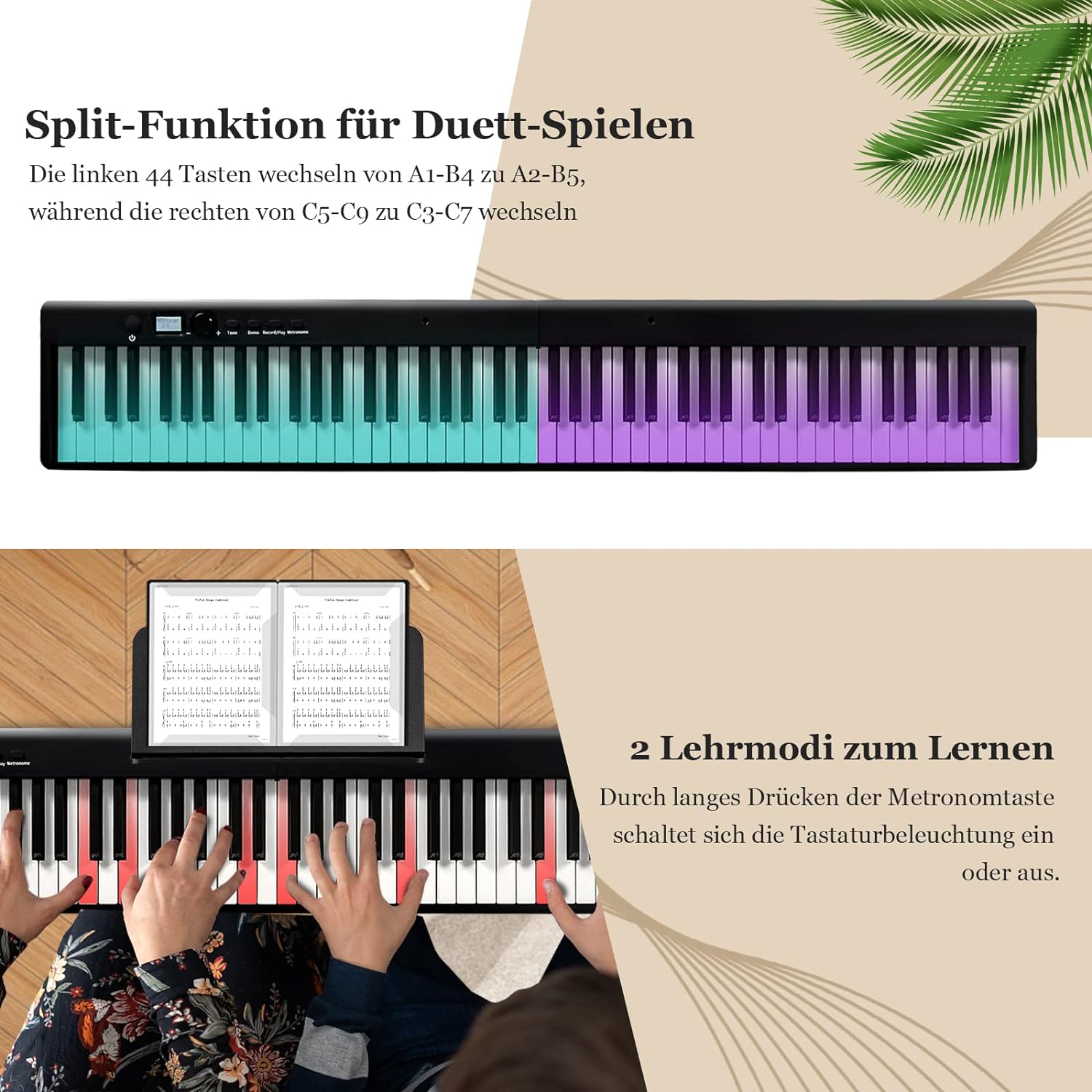 - 【Split-Funktion und 2 Lernmodi】Unser digitales Keyboard verfügt über eine Split-Funktion für das Duettspiel. Nach dem Einschalten der „Split“-Funktion wechseln die linken 44 Tasten von A1-B4 zu A2-B5, während die rechten von C5-C9 zu C3-C7