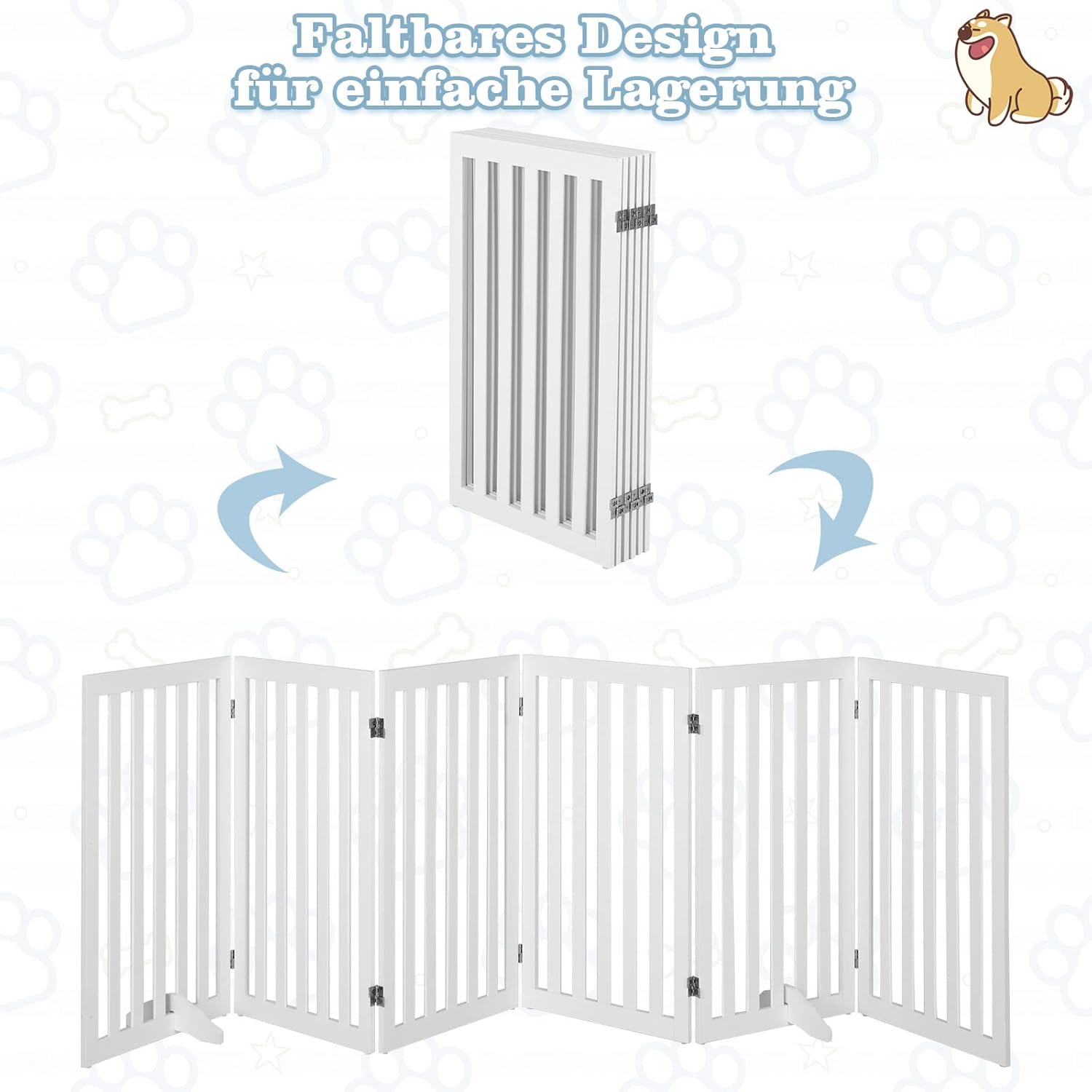 - 【Flexibel einsetzbar】Das Gatter besteht aus 6 Teilen, die durch um 360° rotierbare Metallscharniere miteinander verbunden sind. Daher lässt es sich in allen möglichen Formen aufbauen und eignet sich für Türen, Treppen, Flure usw.