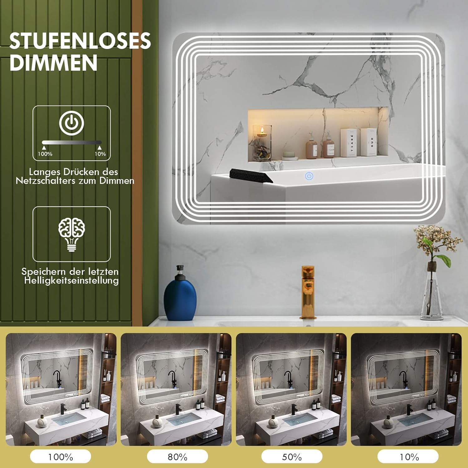 - 【Dimmbar und 3 Farbeinstellungen】Unser LED-Badezimmerspiegel bietet 3 Lichttemperaturen – 3000 K warmes Licht, 4500 K neutrales Licht und 6500 K kaltes Weiss. Drücken Sie lange auf den Berührungsschalter, um die Lichtintensität von 10 % bis 100