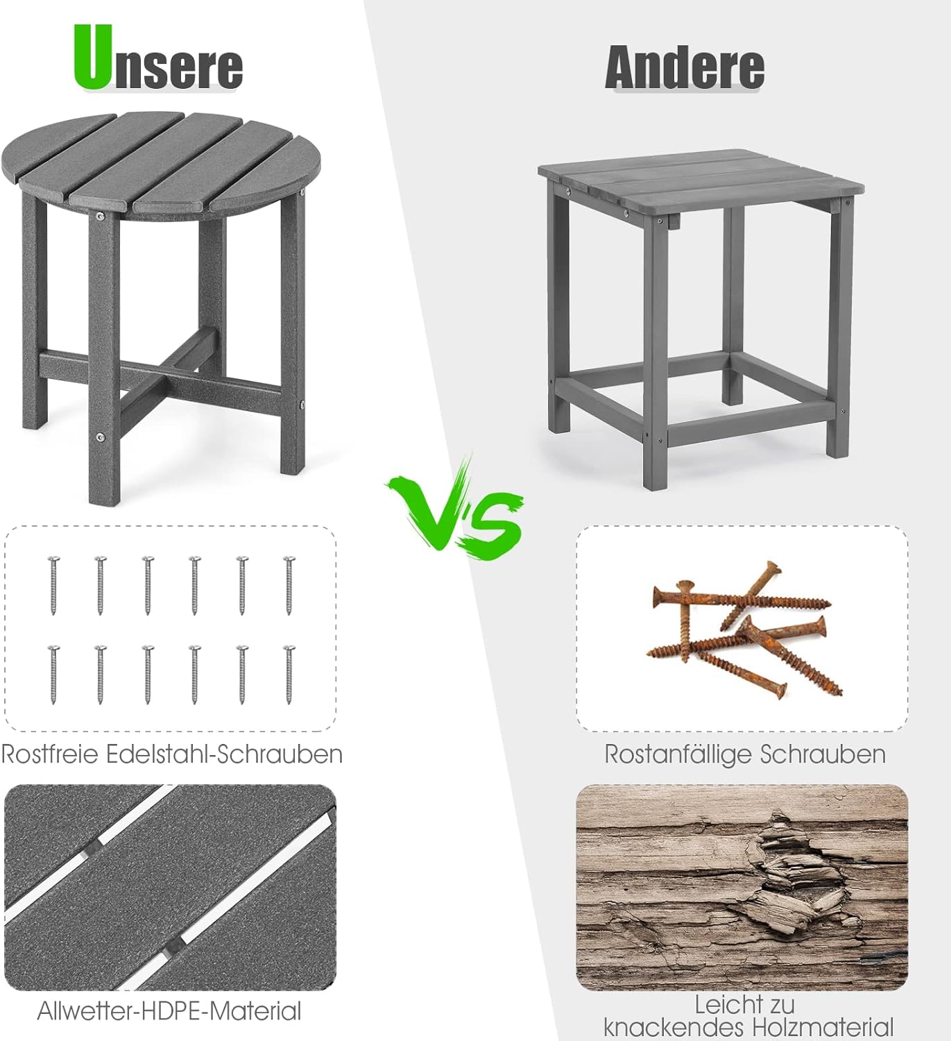 - 【Optimal für den Aussenbereich】Im Gegensatz zu leicht brechendem Holzmaterial und schnell rostendem Metallmaterial besteht dieser Beistelltisch aus wetterfestem HDPE-Material, das sich durch Lichtechtheit, Sonnenschutz und Wasserdichtigkeit